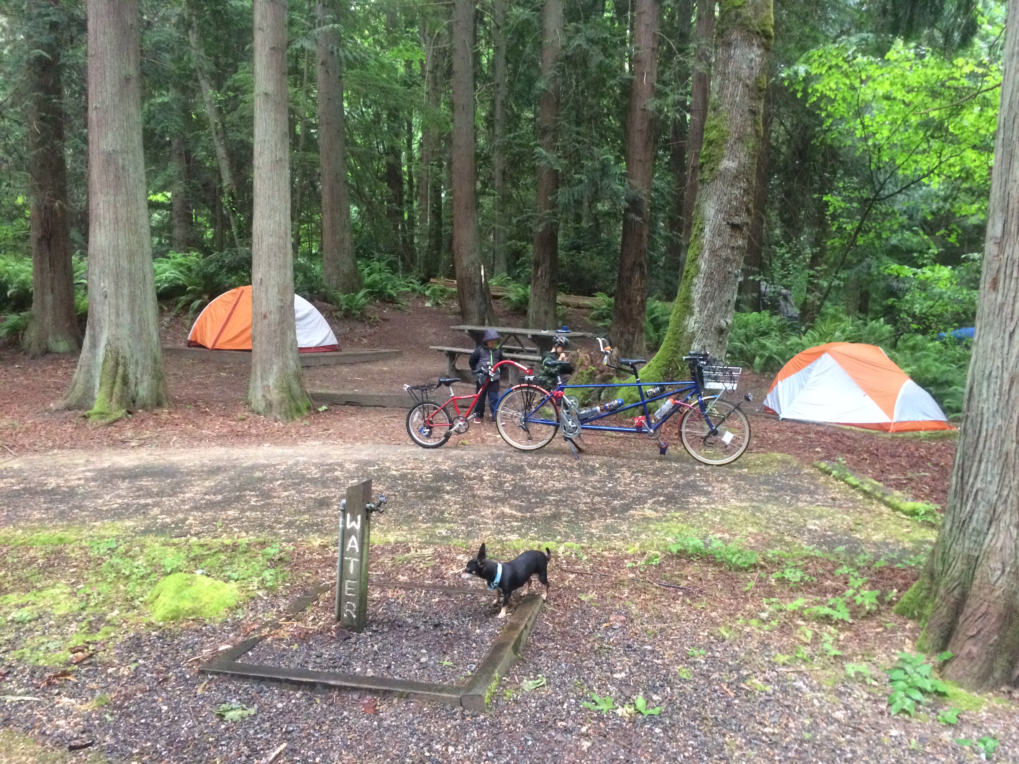 Now Pixie and I bike camped at Illahee last month (Flickr album of 91 photos here), but camping with a regular bike and nine pounds of passenger isn’t nearly the same as proper family bike camping so it doesn’t really count. Good test run, though!