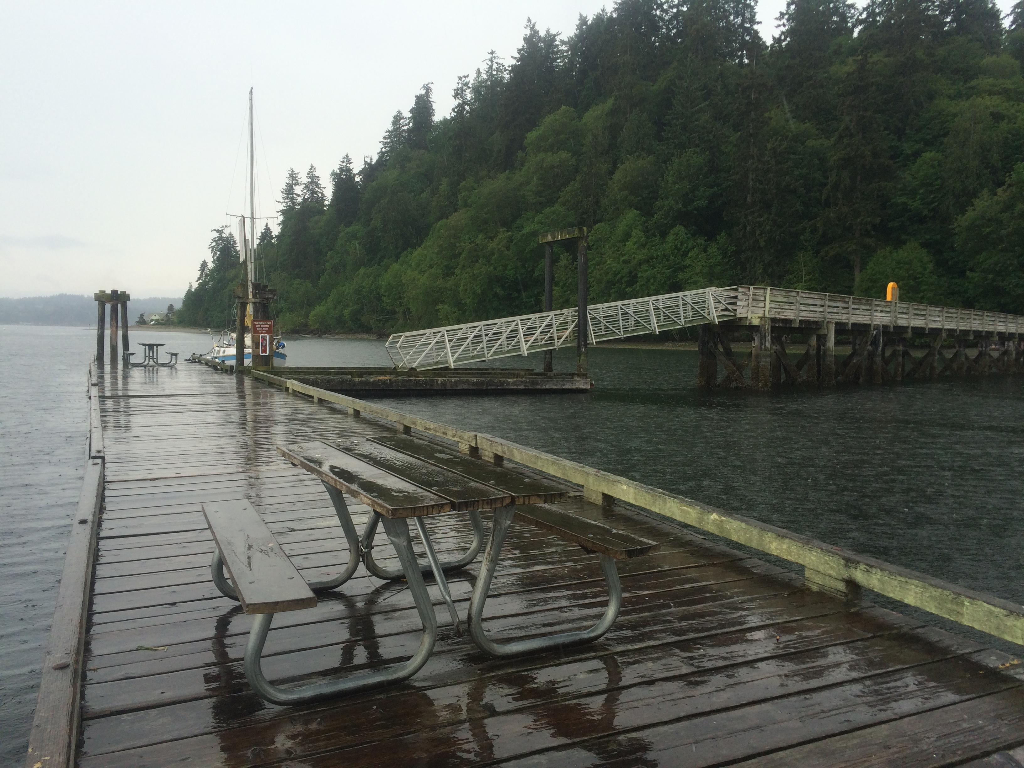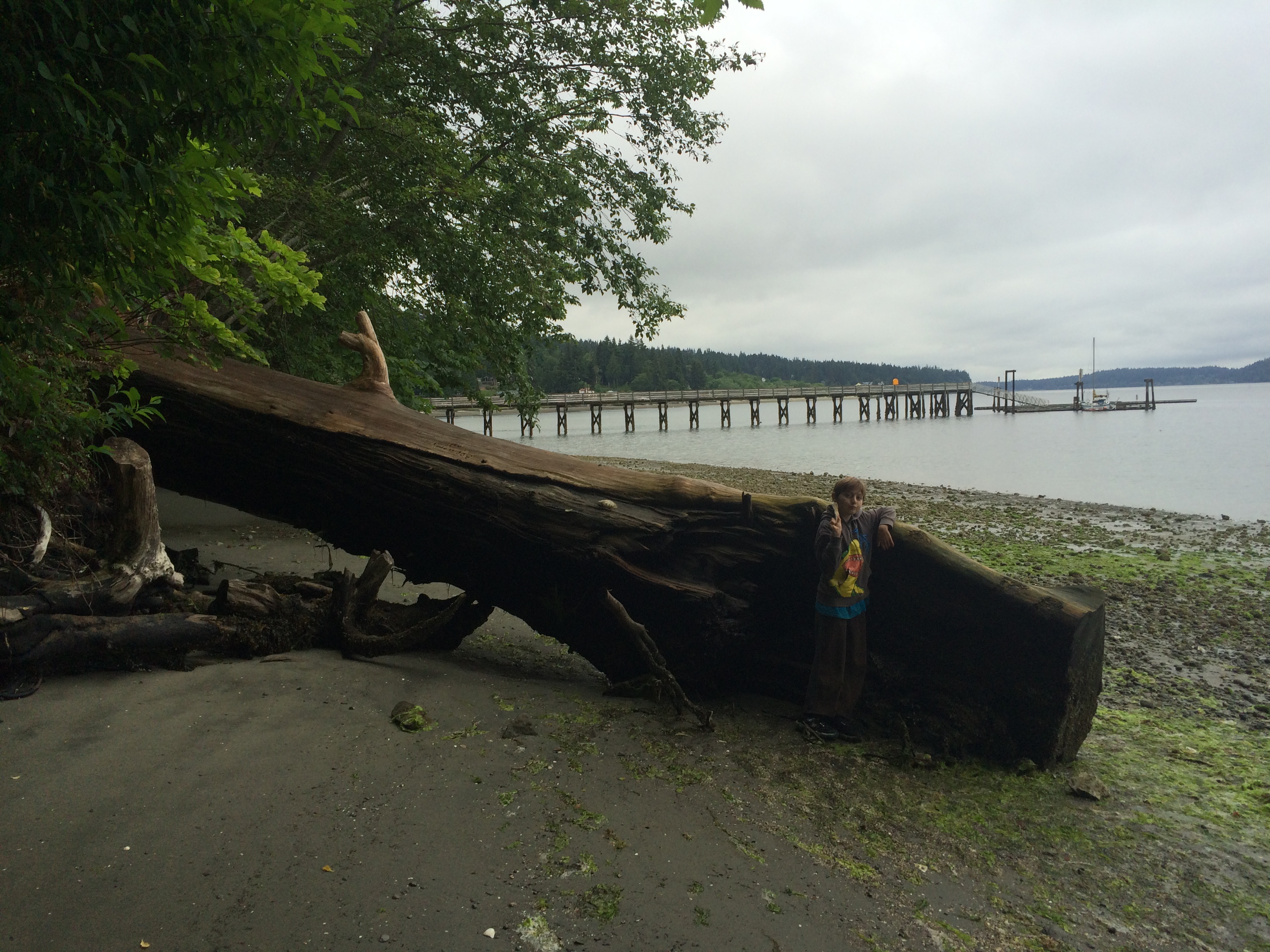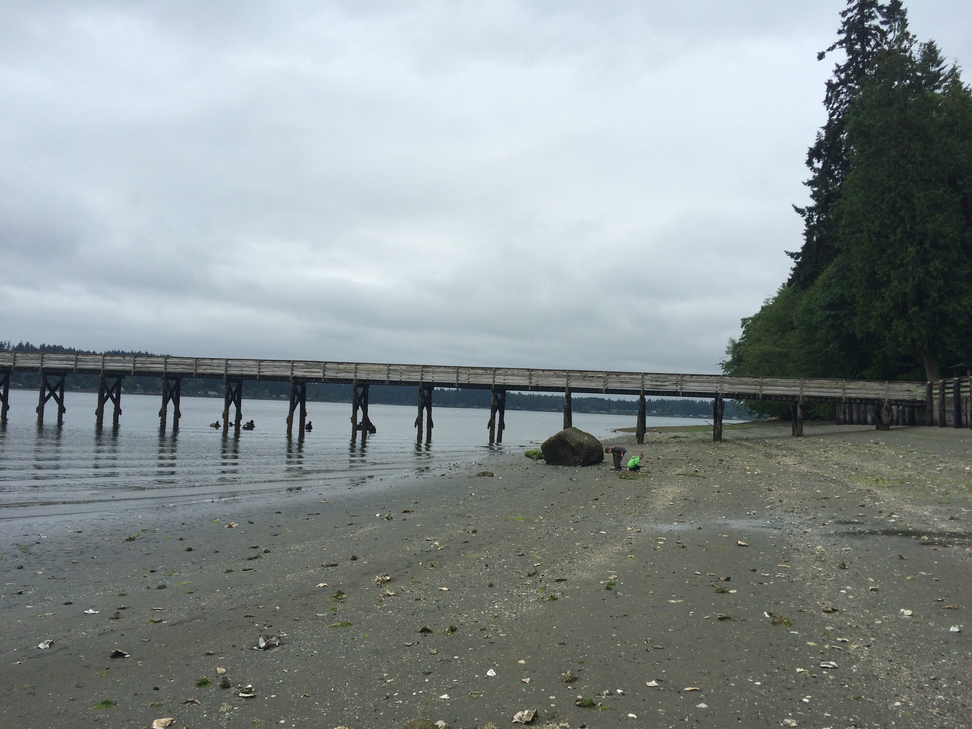 The Illahee beach is terrific with tons of tiny crabs under every rock. And a covered picnic area in the grass and picnic tables with amazing views at the end of the pier! (The pier picture is from Saturday when it was wetter.)