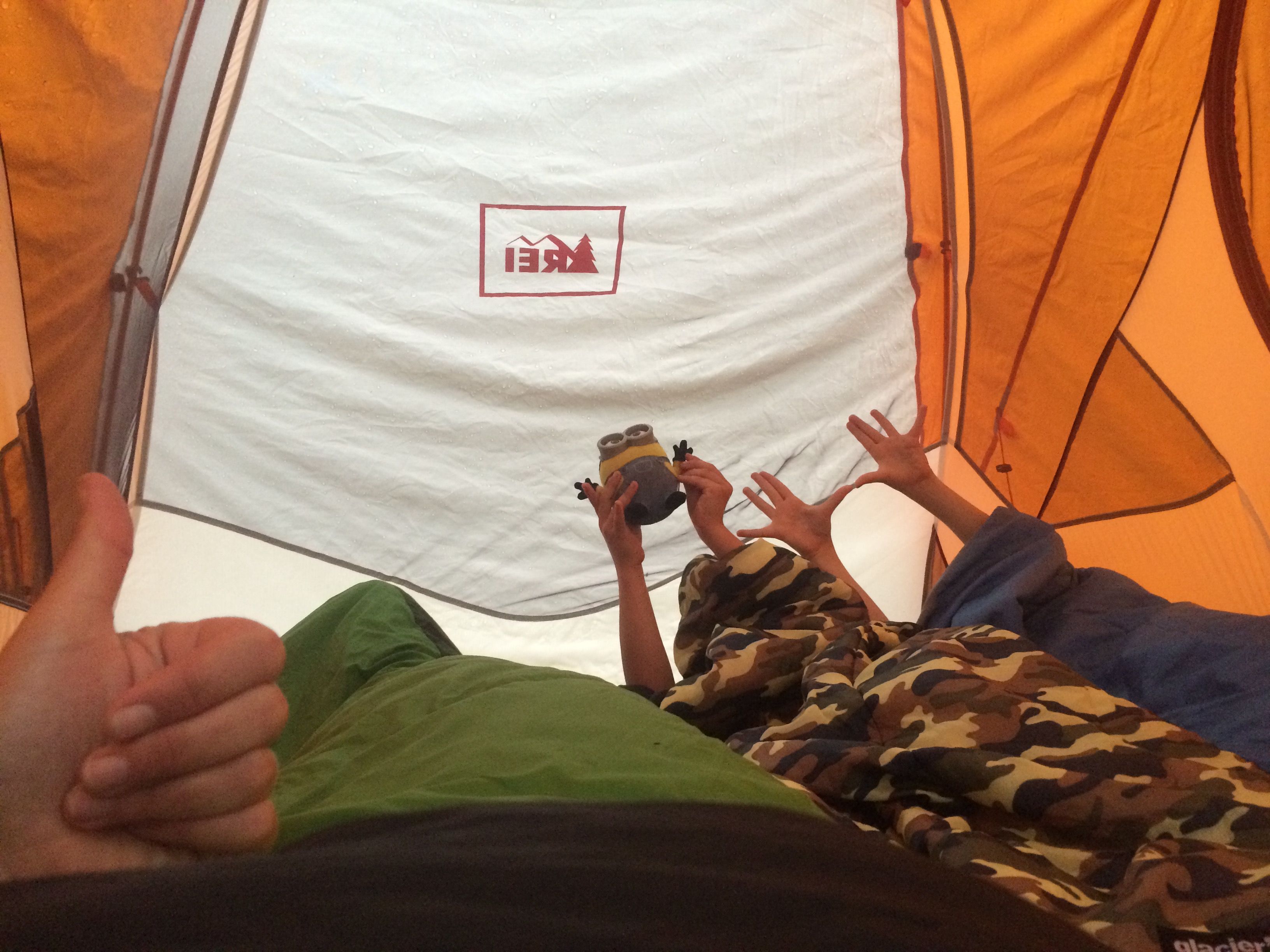 We hit the hay long before Brad arrived. Even though the ride was only 4 miles, I was exhausted and went to sleep at kid time. Normally one gets less sleep camping, but it was nice to get a lot of extra sleep. And the kids both slept with their heads at the opposite side of the tent from me this time, plus they wanted to be next to one another rather than have me in the middle so I was more comfortable than ever before. Next time I’ll see if I can convince the dog to sleep in one of their sleeping bags instead of mine to make it even better. Brad ended up finding a hotel with a group of the randonneurs, but he arrived to camp early in the morning and took a nap so our spare tent wasn’t for naught.