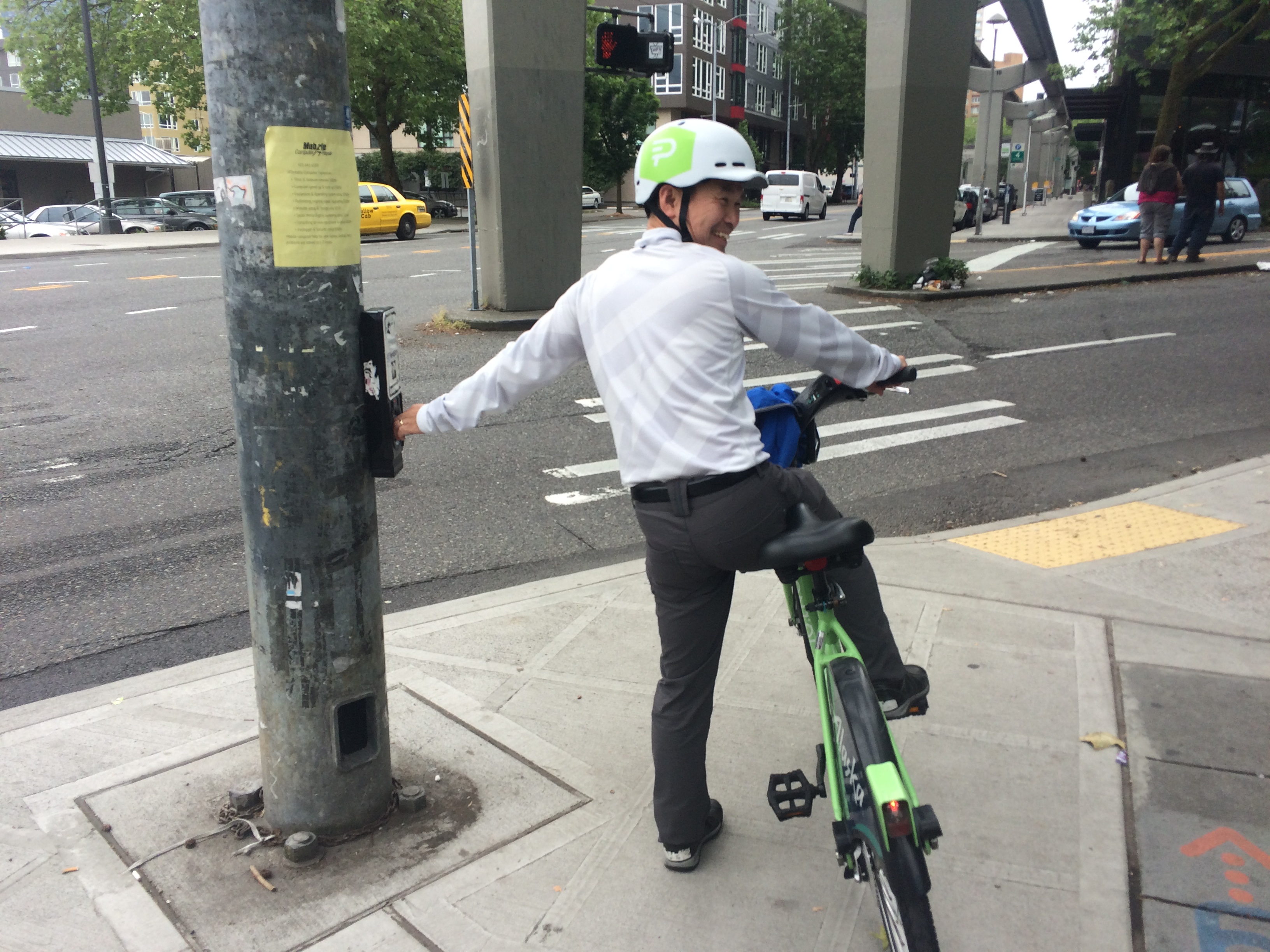 Next up we met up with “celebrity” traffic engineer, Dongho Chang and Darby Watson from SDOT in Occidental Park just across the street from Back Alley Bike Repair. The park is bustling with food trucks, tons of seating, games (currently a foosball table, and I’ve previously seen ping pong and giant chess), totem poles, and musicians.