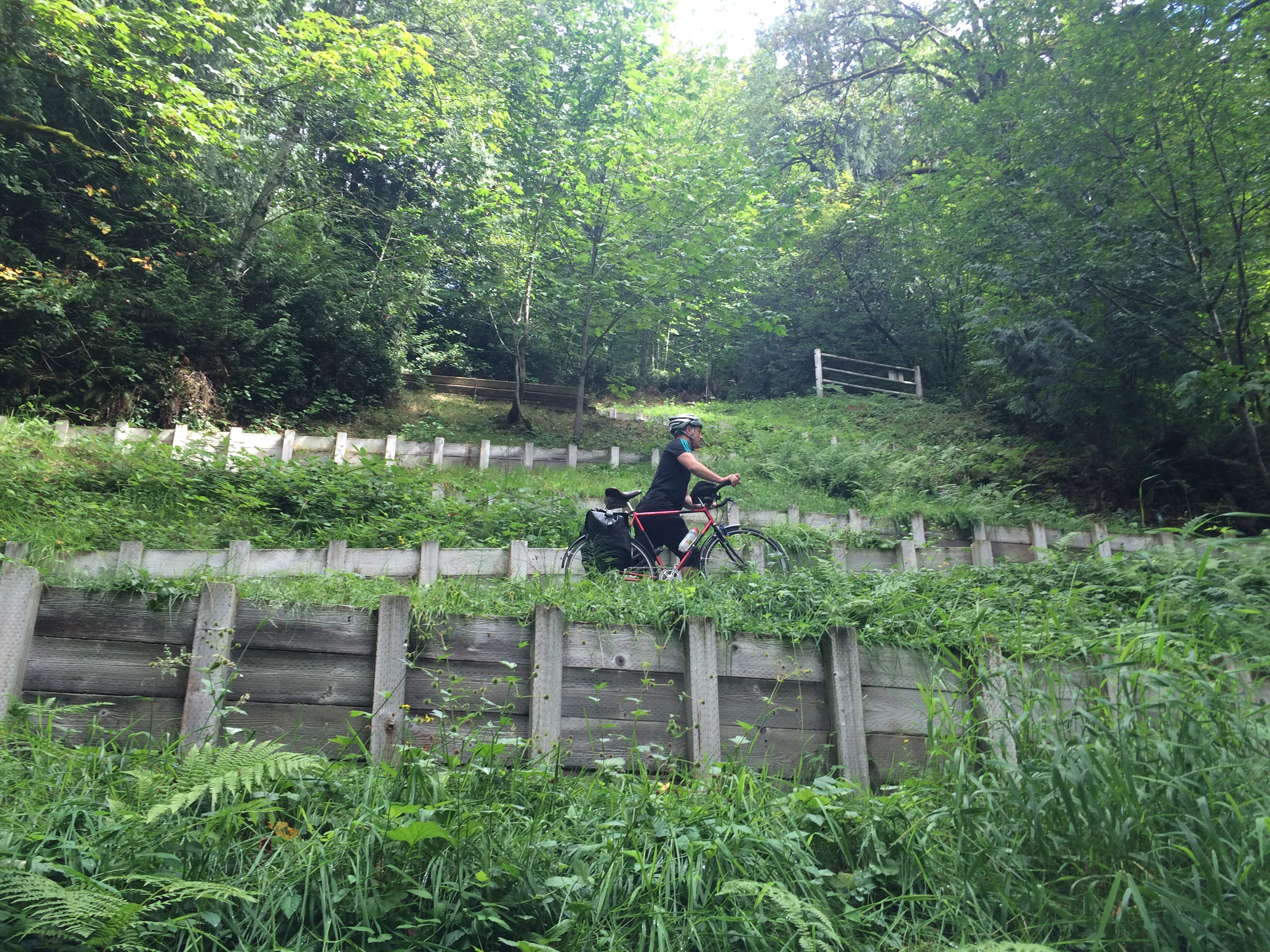Once we got up the switchbacks the trail was great! After a while we saw a sign that warned the trail ended ahead. Velotron worried that meant we wouldn’t be able to get through, but I was optimistic that it meant we’d have to get back on a road. Before we got all the way to that dead end (which has a great vista point and is worth a trip if you’re not on your way somewhere–see Biking Bis: The surprise on the Preston-Snoqualmie bike trail) we looked more closely at the map and realized the dead end was really a dead end and we turned back…but not all the way back, just to the previous cross street, Lake Alice Road. So we skipped some of busy Preston Fall City Road and I got that great switchback photo. And we met some nice bike tourers on the switchbacks, too, whom we saw the following day on the Iron Horse Trail. I have a feeling they intentionally took the trail and knew to turn off at Lake Alice Road.