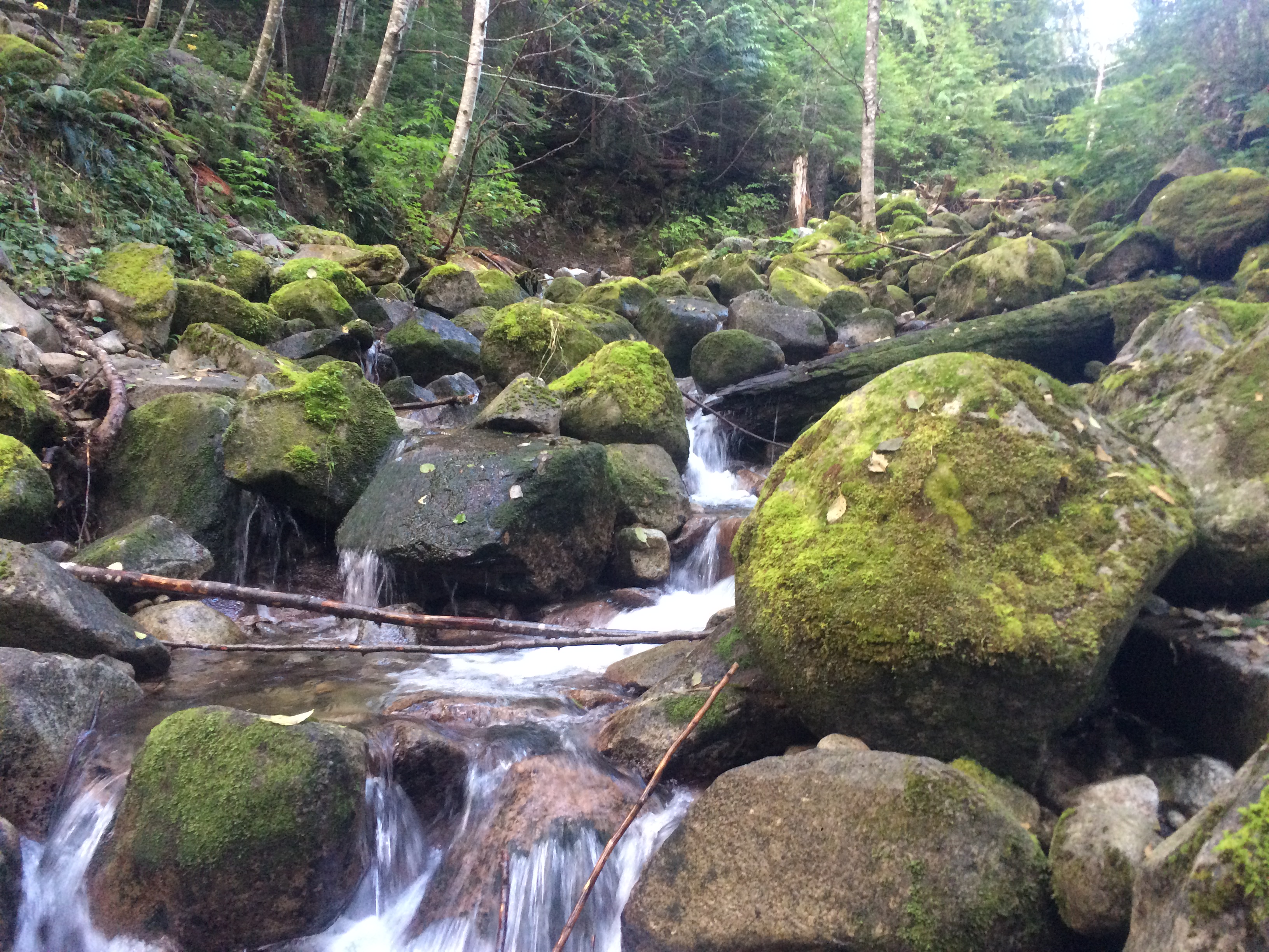 Carter Creek Campground was great! There were several other bike campers there, but it’s divided into three sections so we had our own picnic table and three tent squares. I think Carter Creek and Cold Creek (milepost 2113, where I camped last time) are my two favorite campgrounds in Iron Horse State Park. The creeks are right there for easy water collection and they’re pretty. Alice Creek Campground (milepost 2127, the closest to farthest west) is very exposed and the creek is on the other side of the trail. We checked out Roaring Creek Campground the next day and didn’t explore enough to find the creek, but it wasn’t right by the campsites. It was pretty, though.