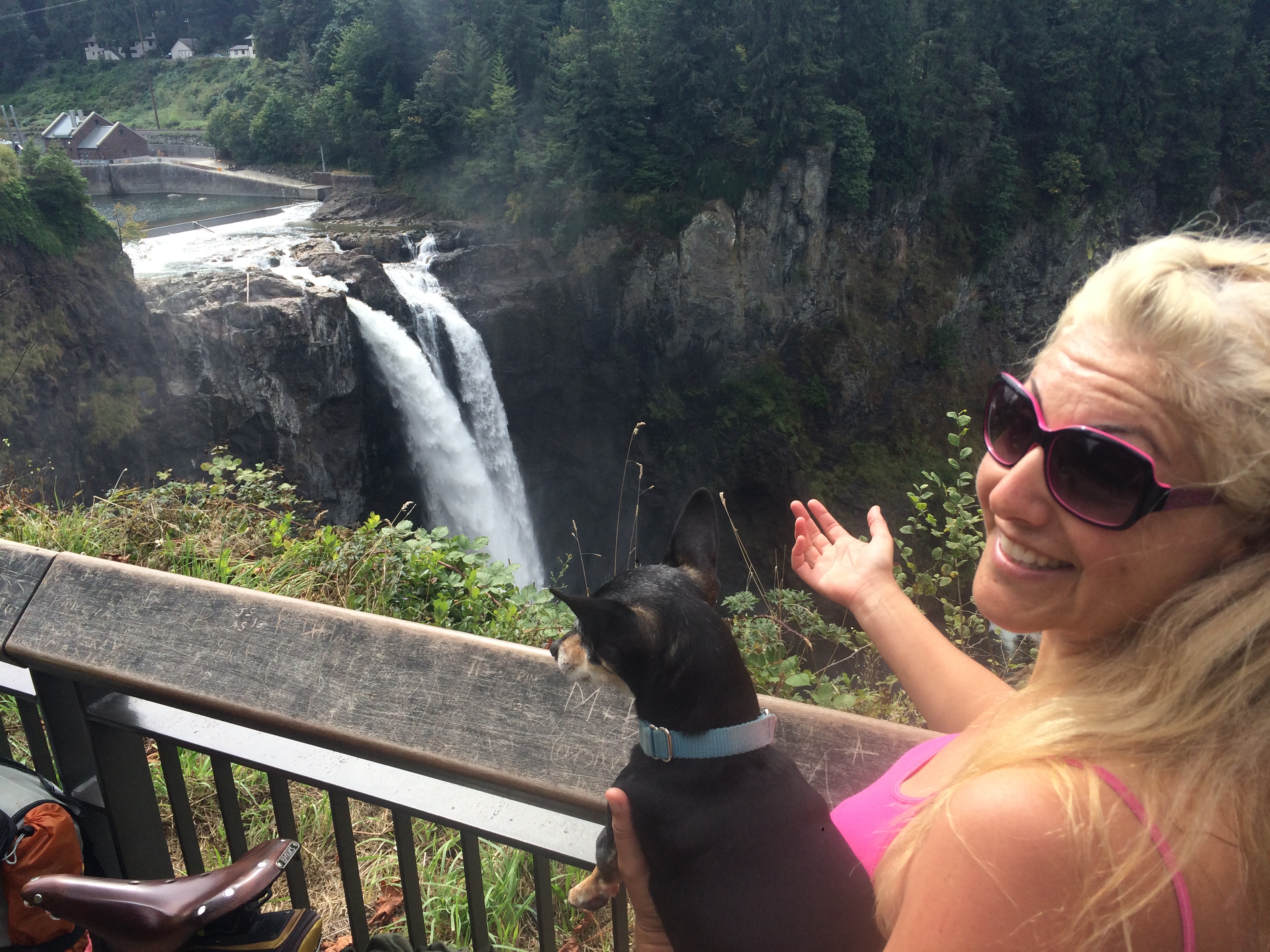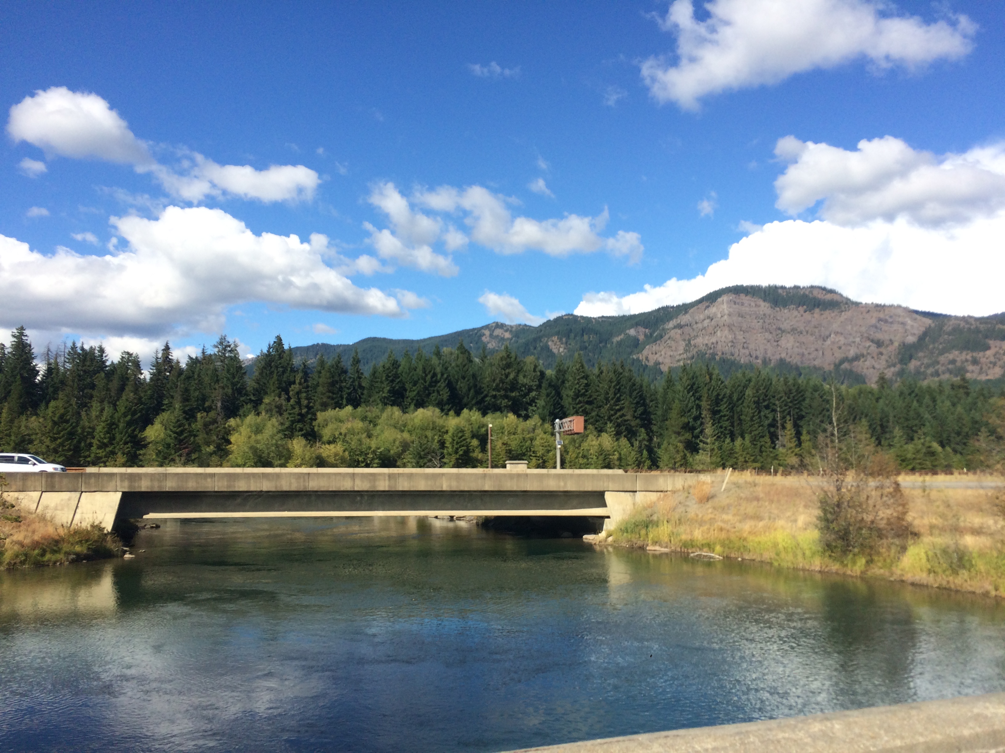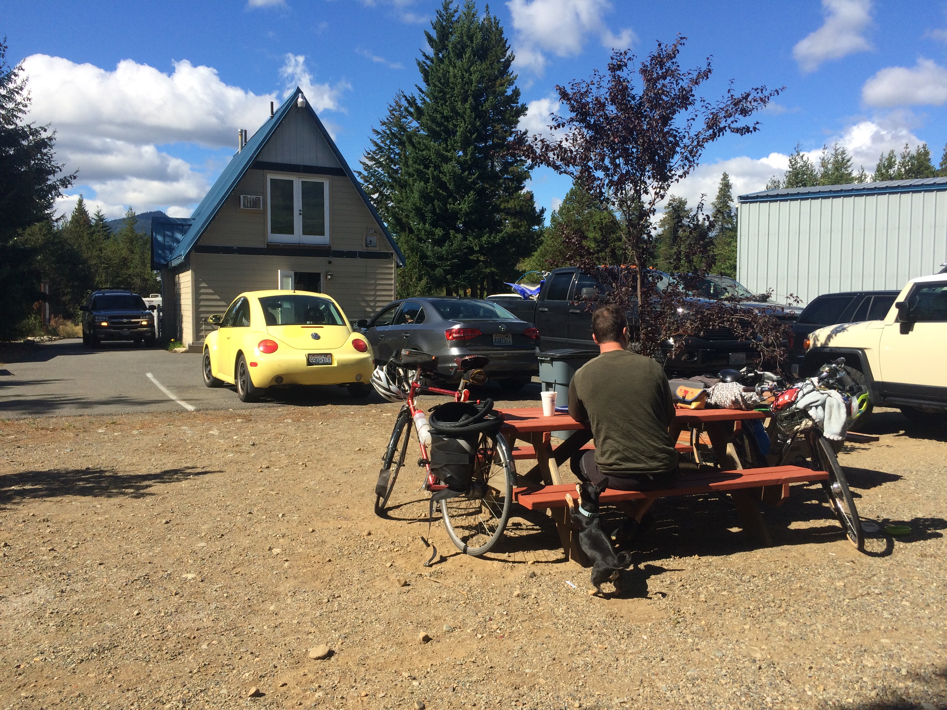 We ended up stopping in Easton for a 55-mile day rather than an 80-mile day. Mountain High Hamburgers was perfect. Over 40 flavors of milkshakes and each hamburger named for a pacific northwest mountain. The bathroom was full of framed photos of Mount St Helens erupting and several outdoor picnic tables meant it was easy to eat with Pixie.