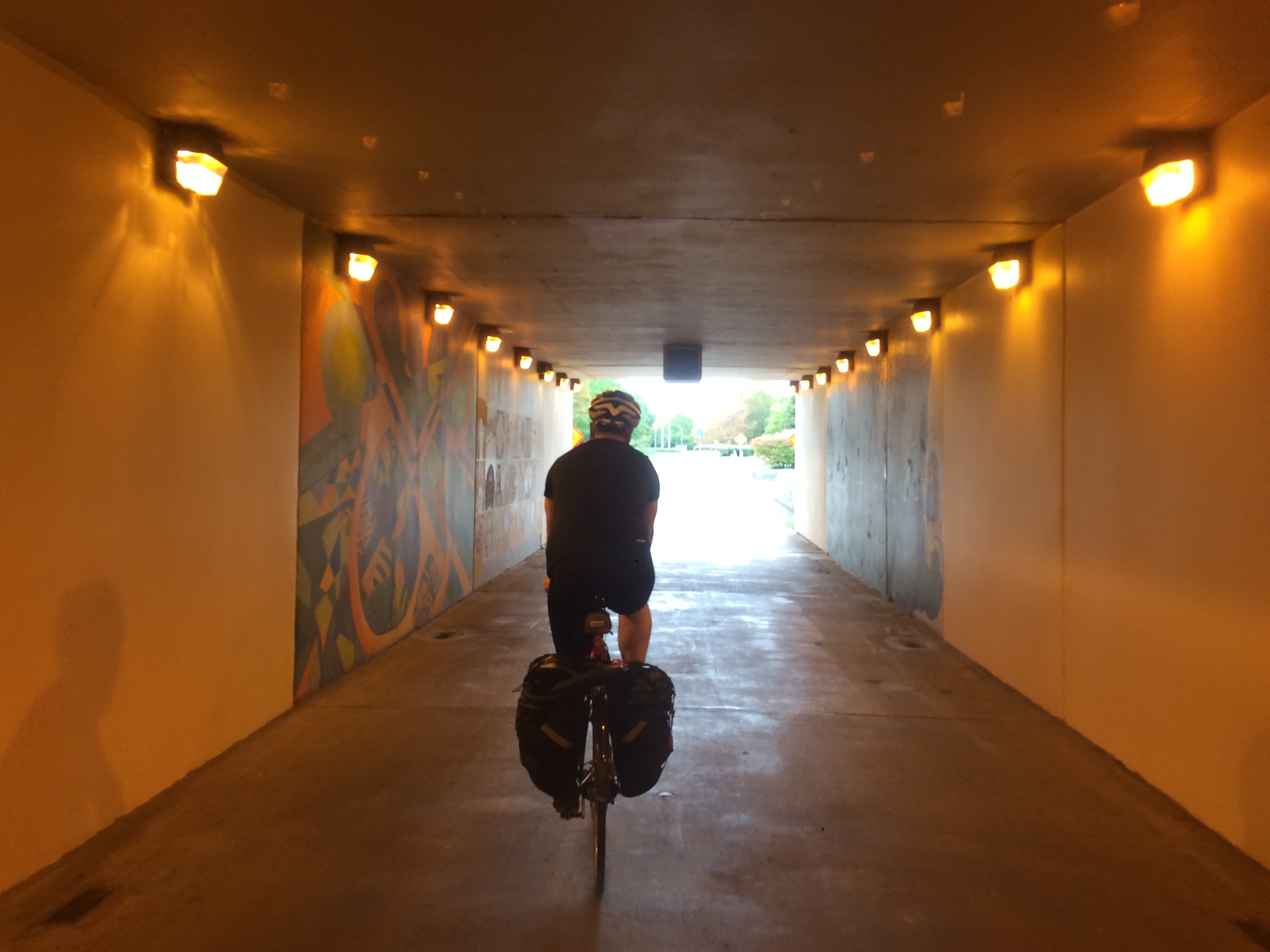 We were right to hit the tunnel Sunday morning rather than Saturday evening. It was packed! We saw at least 70 people in there (and three other dogs), more people were on bikes than walking, but there were plenty of both. This was Velotron’s first time in the tunnel and I think he may have been a bit disappointed that we couldn’t find a spot dark enough to turn off our lights and appreciate the total dark. But I thought it was fun and festive.