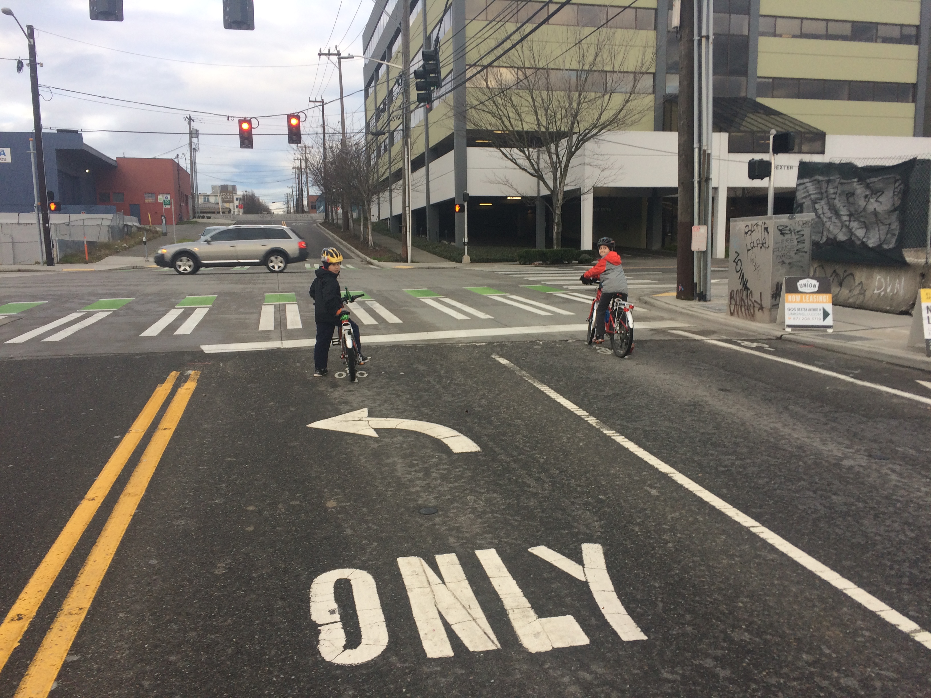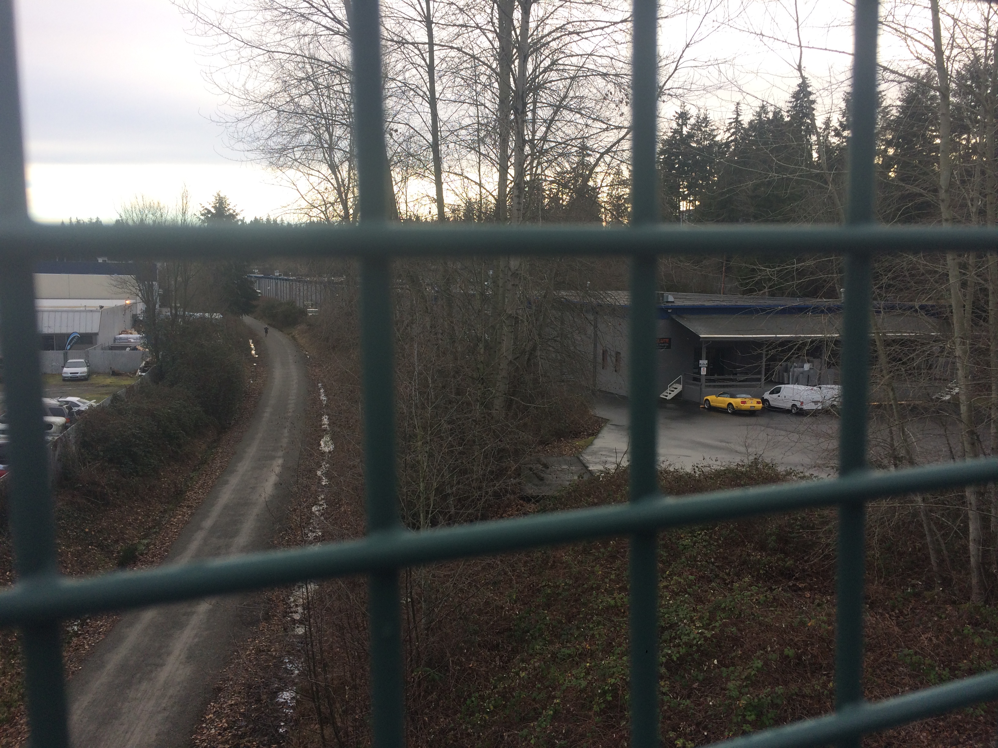 Google maps had me exiting the CKC at NE 112th Street, one block before our destination, but rather than ride that one long block (on the sidewalk, of course, in this area) I decided to stick to the trail because even if it tunneled under our street, we’d have a shorter amount of sidewalk to ride back from the following intersection. Turns out the trail did indeed cross under NE 116th Street, but that meant we got to ride a tiny bit more of the CKC. Unfortunately that also meant we had to cross a big street and the people turning right from 120th Avenue NE onto NE 116th Street were not keen on allowing us to cross in the crosswalk.