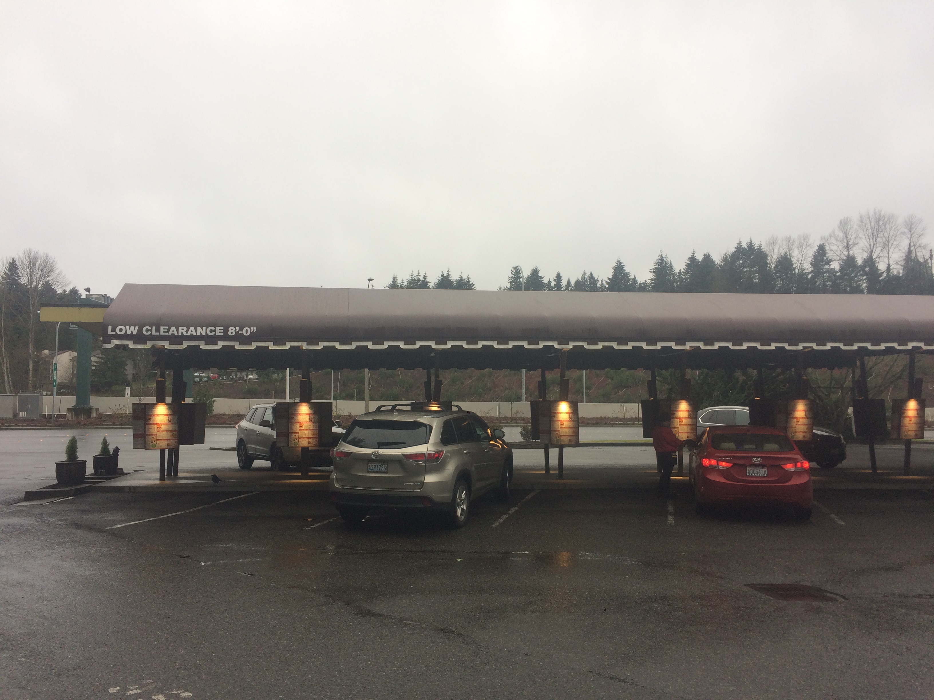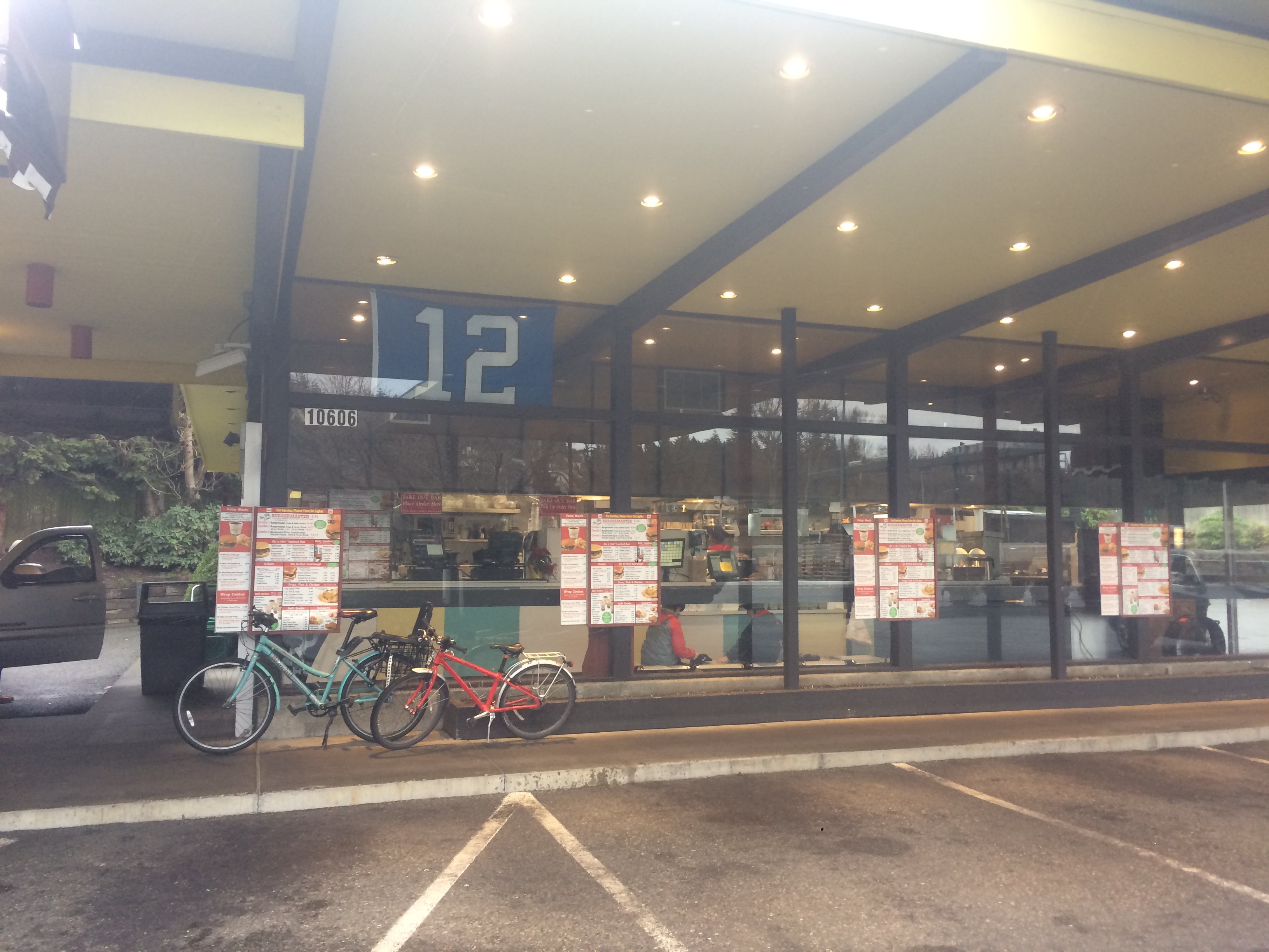 I was dismayed to discover the South Kirkland Park and Ride is on the side of a hill, but it was OK this one time and we can use a different bus stop in the future. The short ride to Burgermaster wasn’t bad–we cut through the parking lot of a La Quinta Inns & Suites and approached via the sidewalk…and immediately realized Burgermaster (like most of the eastside?) is designed for people in cars.