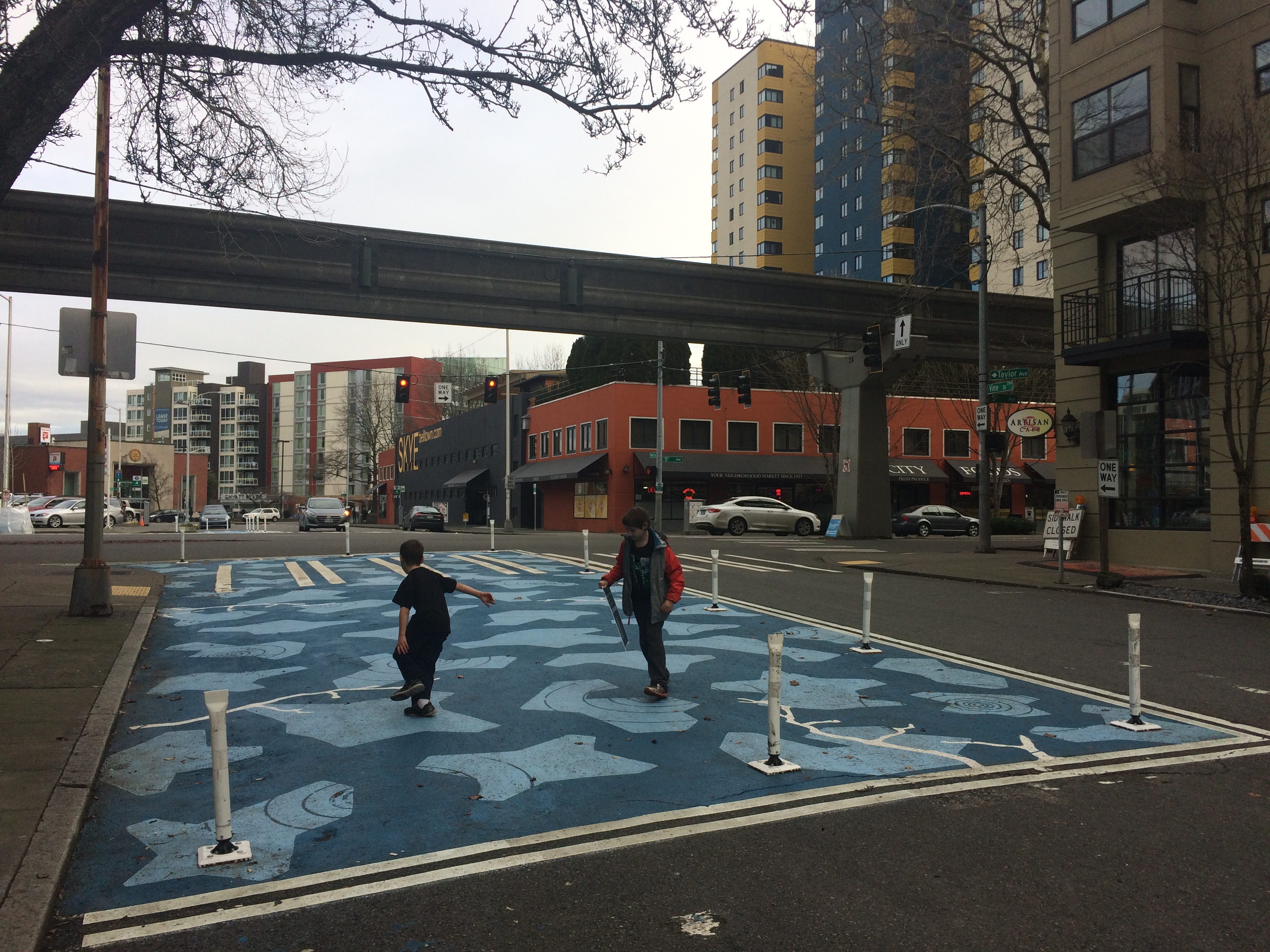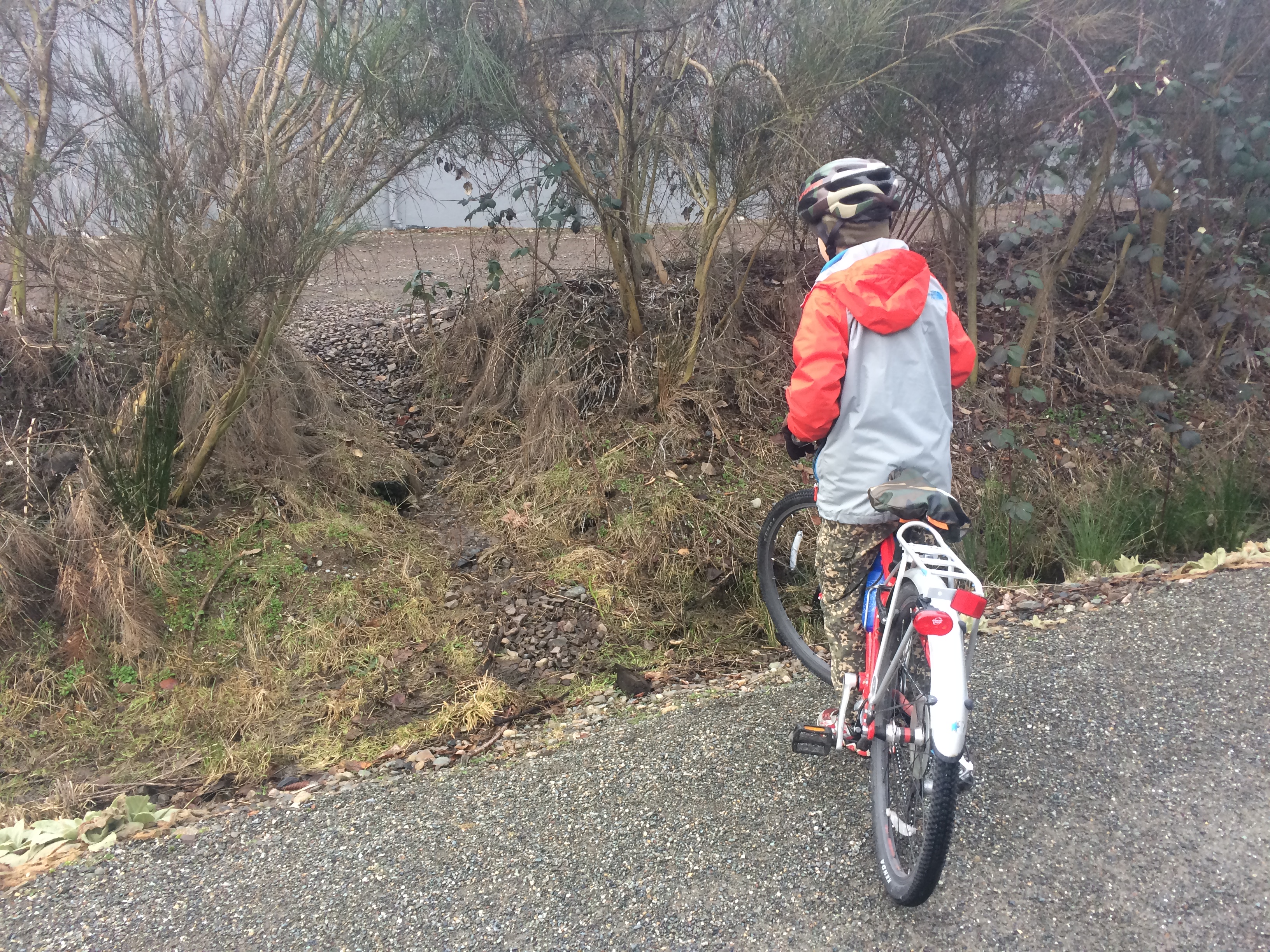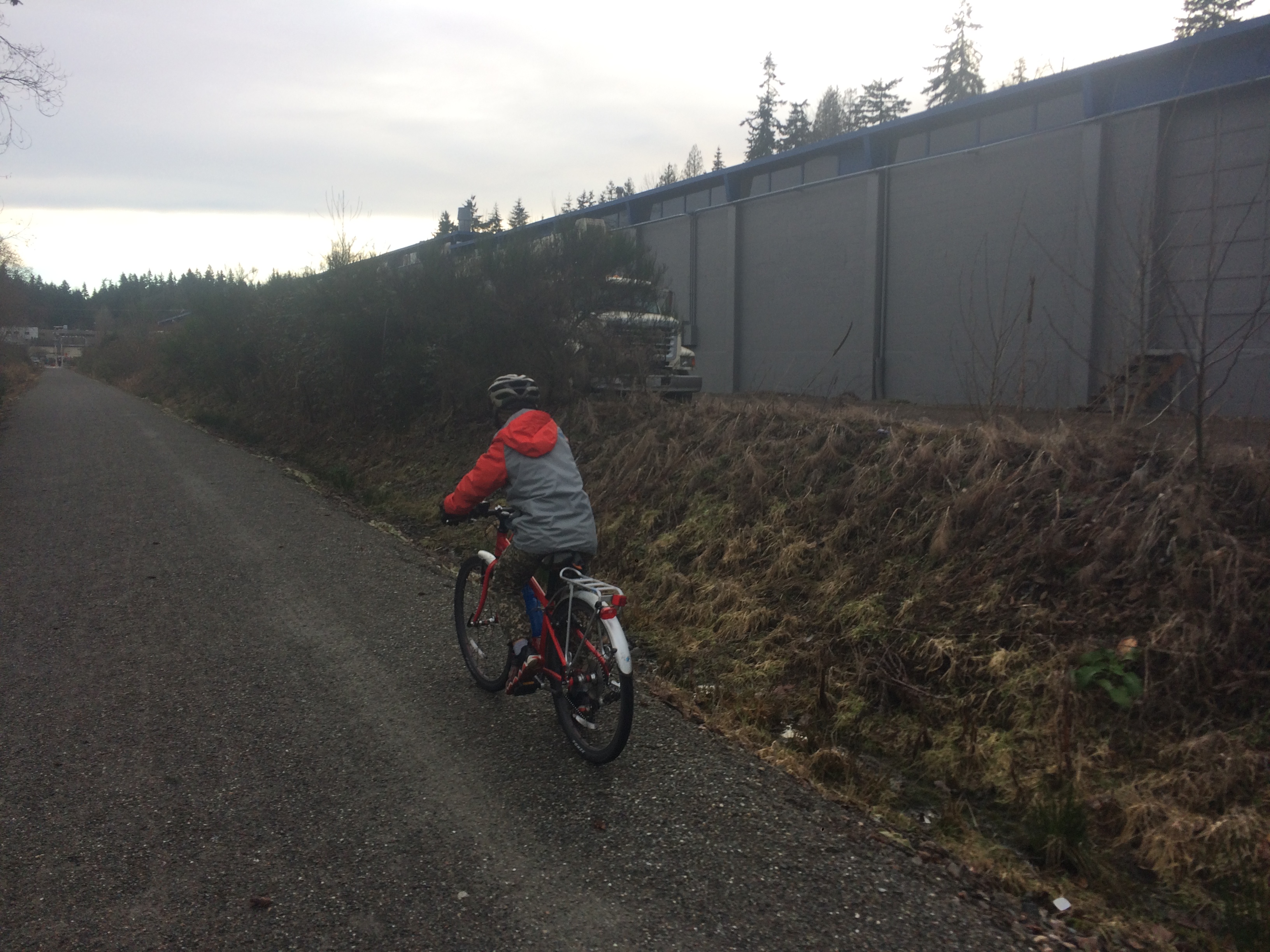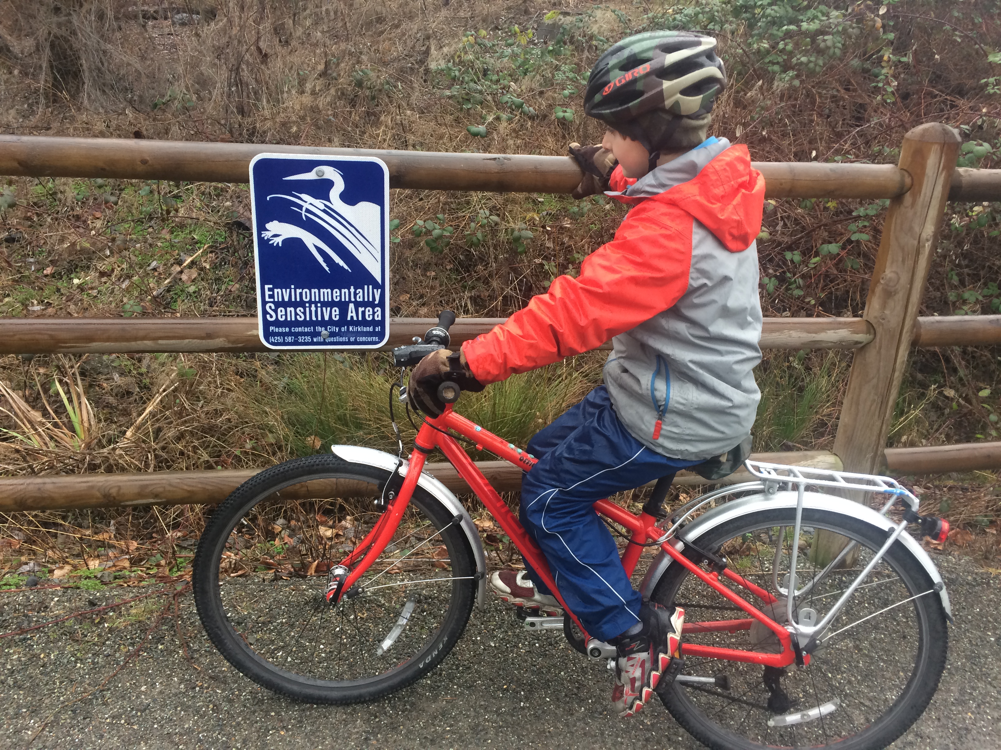 We rode 4.9 of the 5.5 miles of Cross Kirkland Corridor and it was awesome! My nine-year old had the most fun of all, skidding–intentionally and alarmingly–every 50 feet the entire way. I was relieved I had just one kid skidding all over the place on his own bike this time, but we talked about coming back on three bikes–my preference is for a nice day in the summer, the kids’ is for an even rainier day because they’re really into wetlands habitats. I forsee summer visits with trailside blackberry-picking stops, the kids plan to search for the “very large duck and badger” depicted in the Environmentally Sensitive Area signs.
