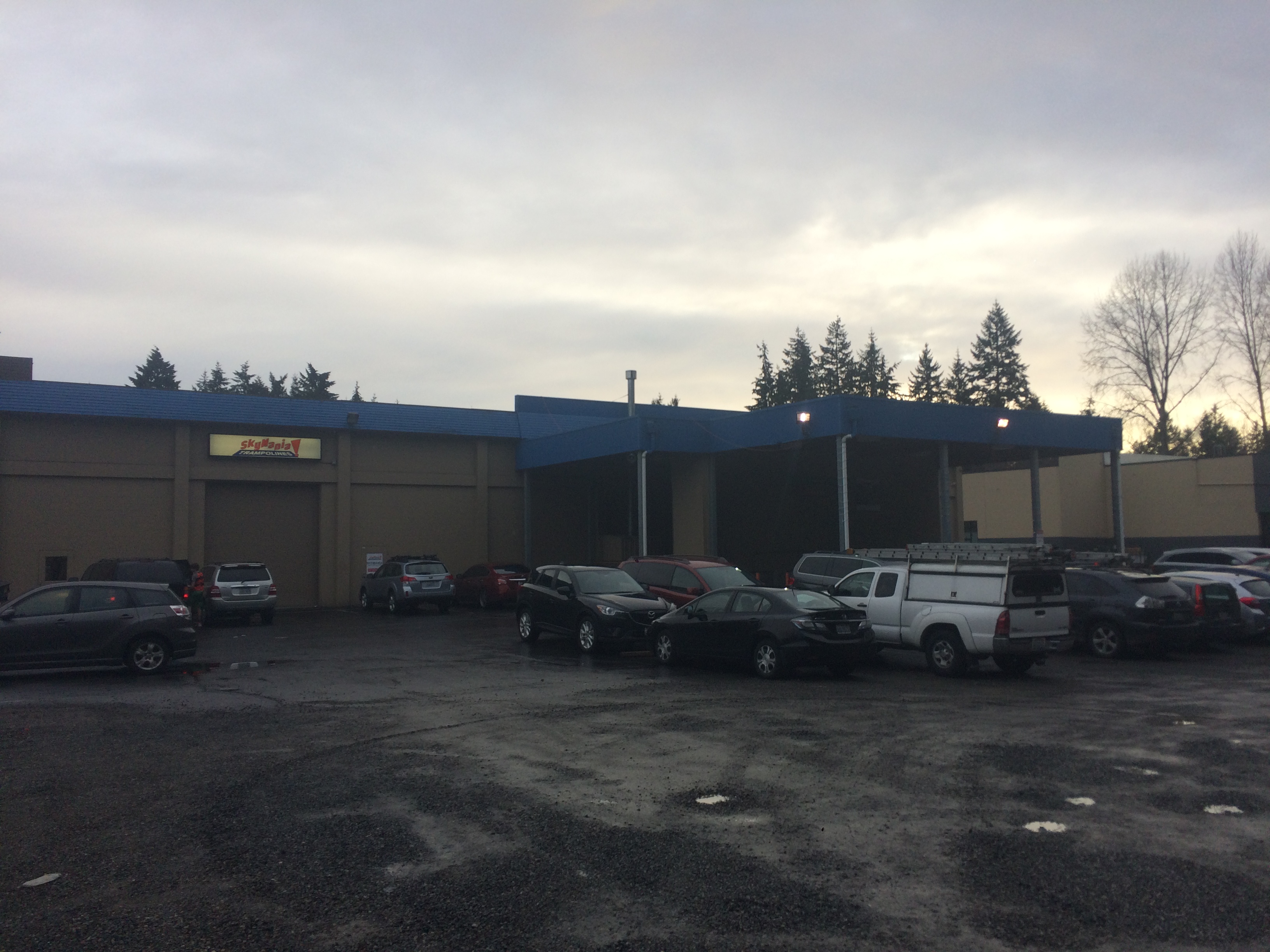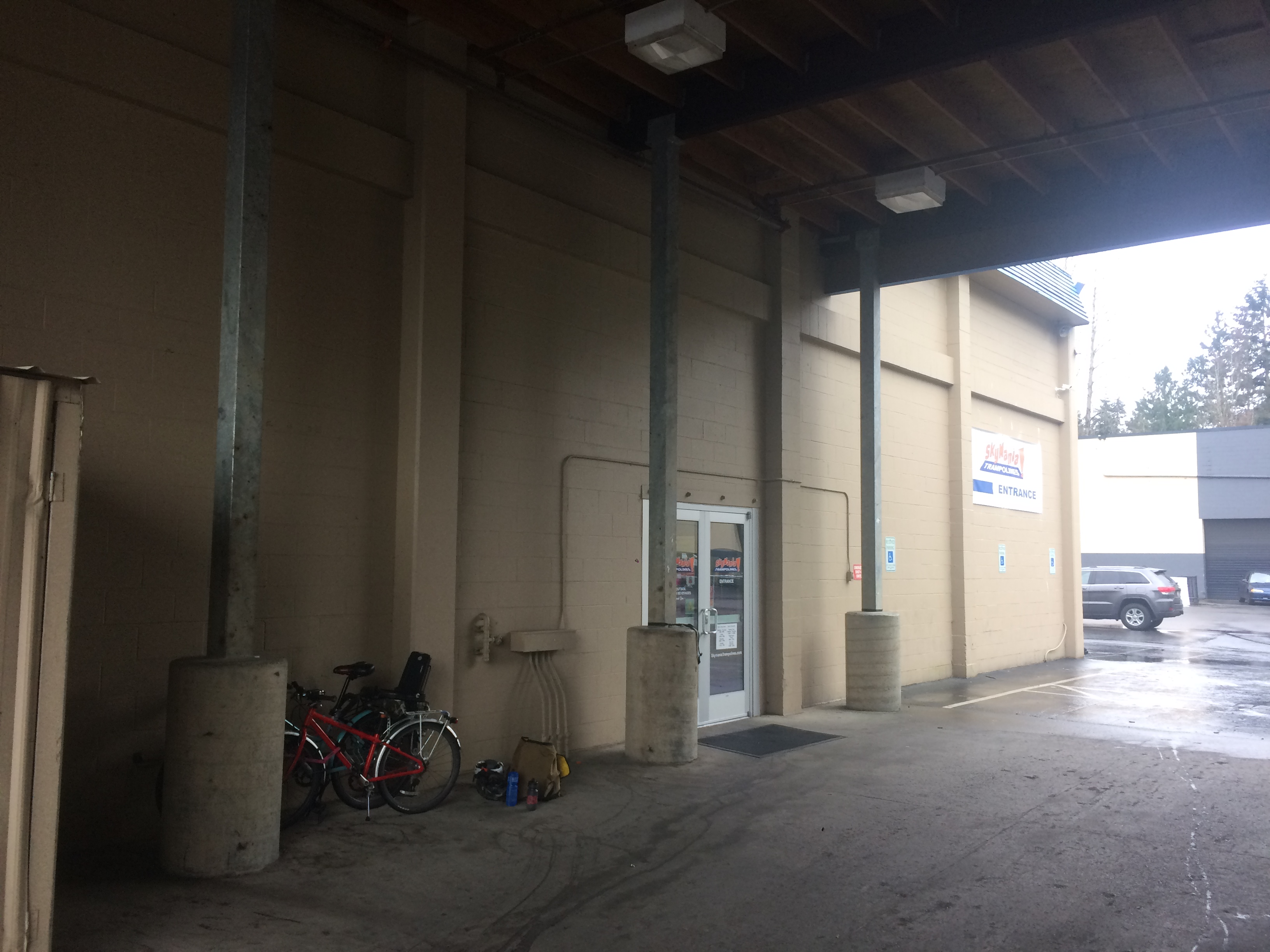 Skymania is in a big nondescript building with huge parking lot and no bike rack. But there was lots of space under the overhang by the front door so we locked up to a pipe under that.