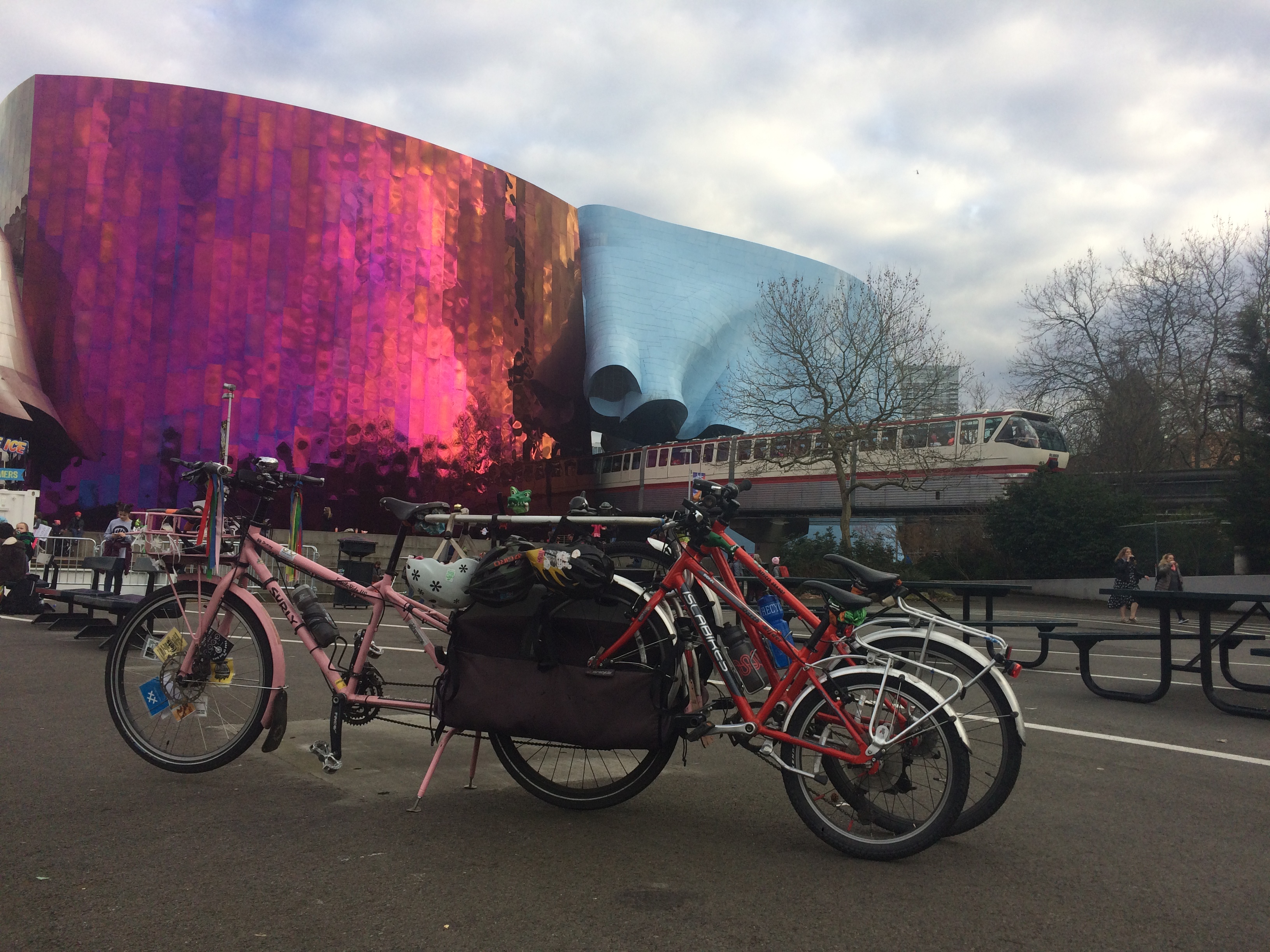 It worked great! The 1.7 miles to the bus stop was flat except for the two downhill blocks to get from home to the Burke-Gilman Trail and the ramp by the UW light rail station to get down to the Lake Washington Loop from the Burke-Gilman Trail. And 35 stairs to the bus stop (I carried the bikes one by one).