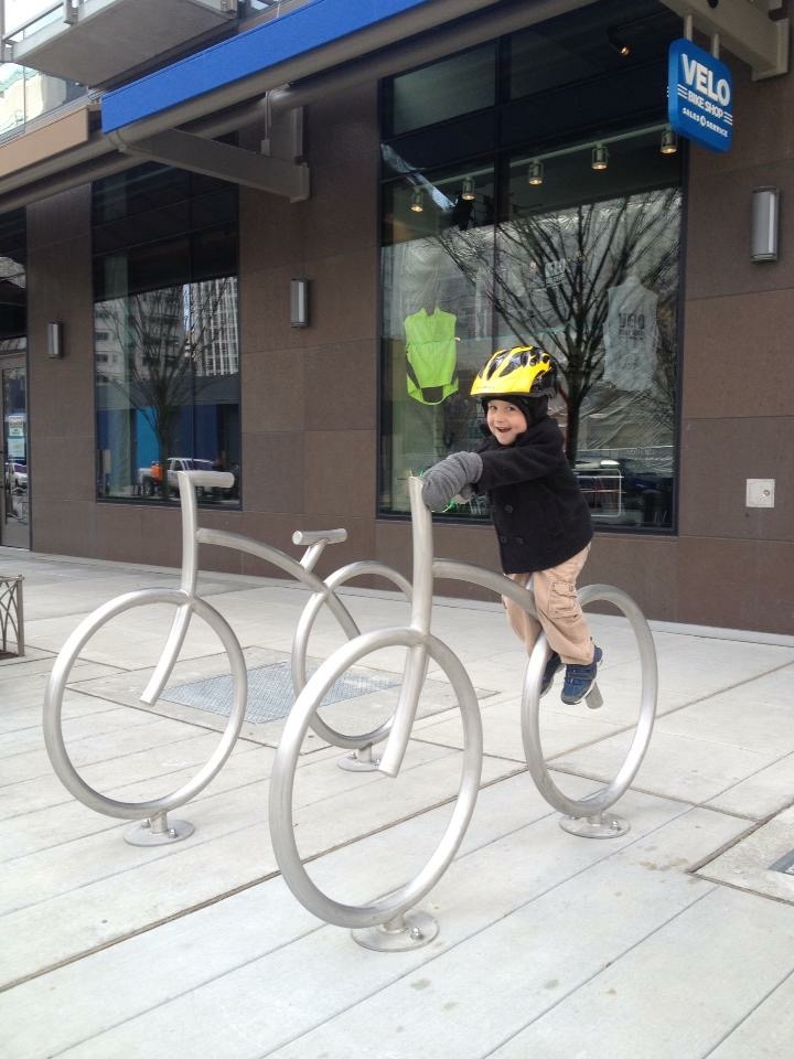 The kids ran straight for the Lego table while I test rode the bike with Leonard, perpetual employee of the month. He’s a stuffed dog my kids have loved since meeting him five years ago during our very first visit to Clever Cycles and if he ever disappears, my firstborn probably stole him. Pic from our first visit to Clever Cycles: