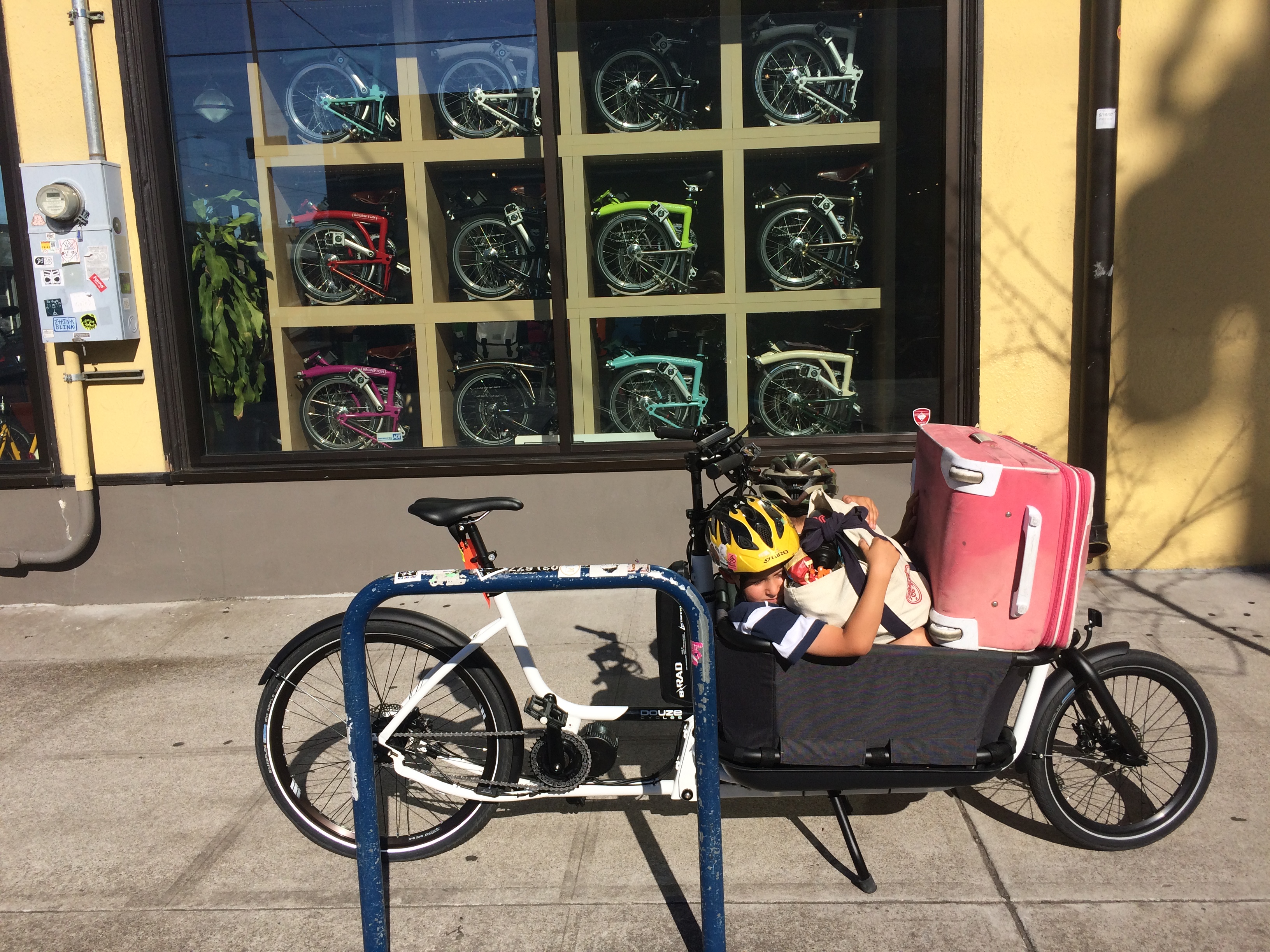 Then I test rode with the kids and they complained that the small box was cramped. It was, but I love riding a bakfiets when in a flatter-than-Seattle city so there was no chance of me swapping for a different bike. p.s. Douze makes three sizes so don’t worry if you’re in the market! And anyway, adding the luggage after they said they were cramped made them appreciate what room they had. Like most things in life, it’s all relative. I grabbed a Yuba Cargo Strap (psst…there’s a hidden cargo strap theme for the week) from Clever Cycles to attach the bag and we were totally fine for the half-mile ride to our Airbnb.