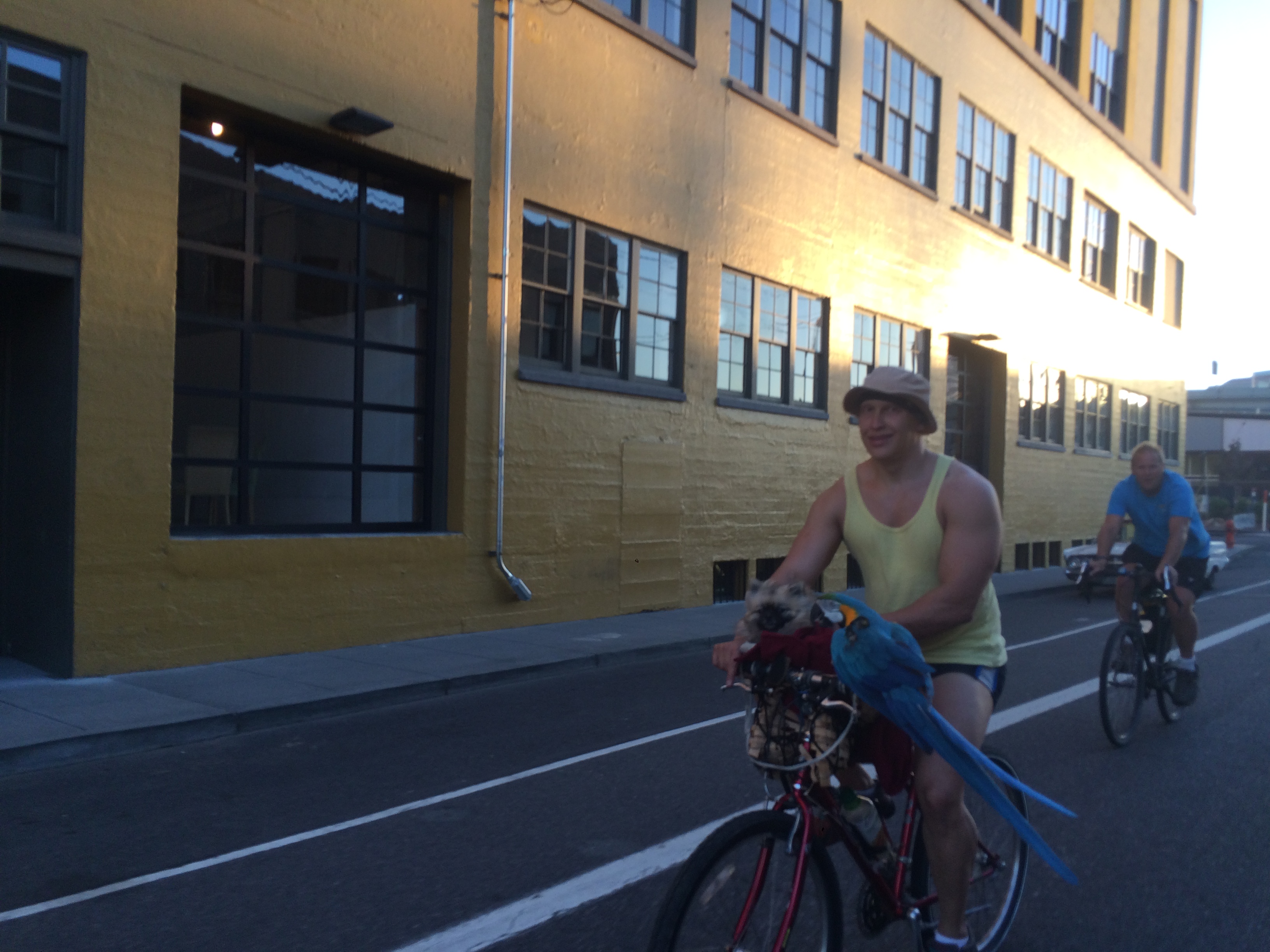 And then we joined the Thursday Night Ride for the first half hour. I saw a bunch of people I know and was surprised to see a few Seattleites! Turns out there were a bunch of people in town for the International Open Streets Summit. There are always a lot of amazing bike things to see in Portland, but I think the most amazing sight tonight was the guy with the parrot and Pomeranian on his bike.
