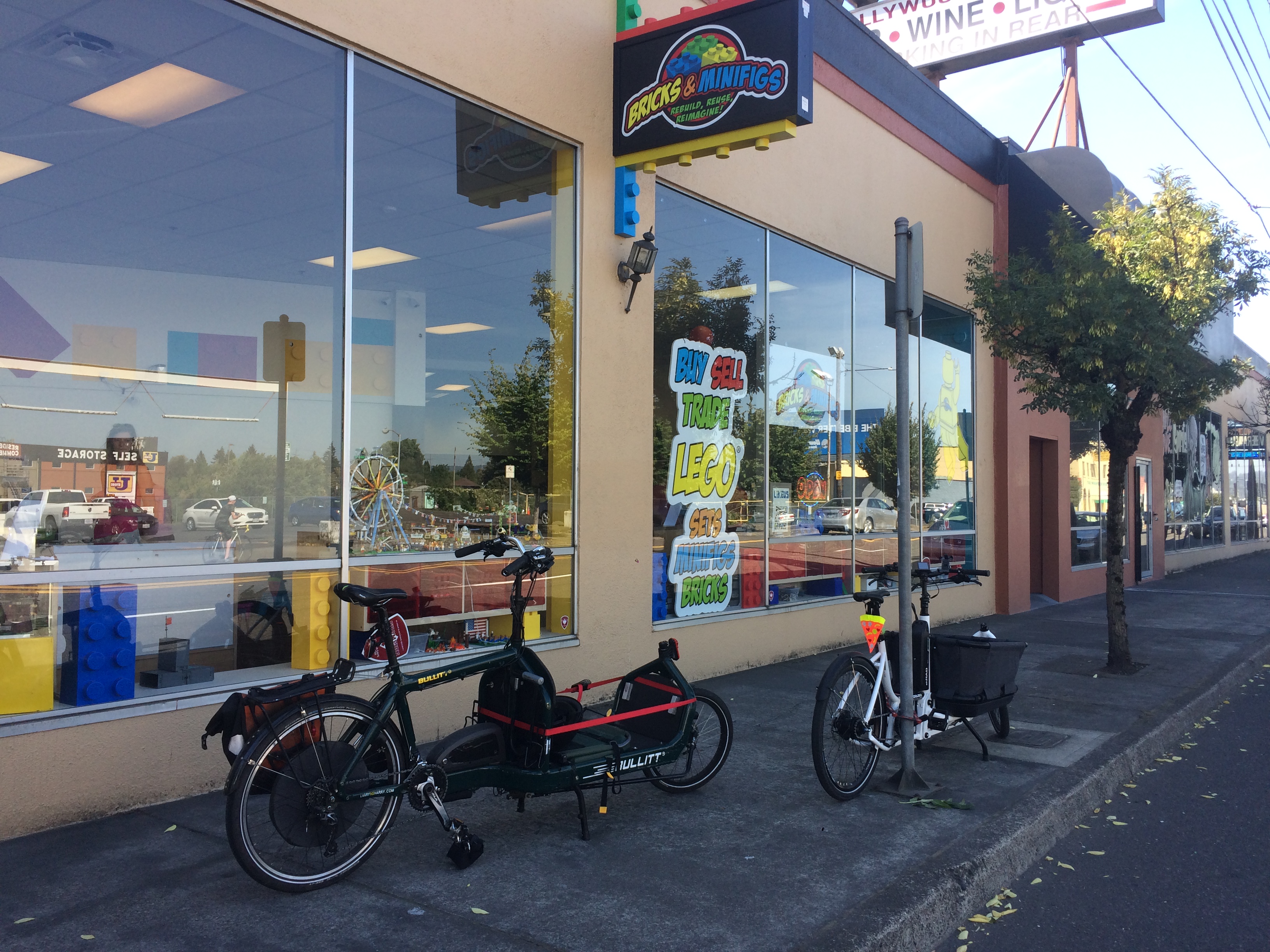We attempted to start our day with second breakfast at Slappy Cakes (griddles built into all the tables–so dangerous, the kids love it!), but the wait was too long so we hit the playground in Laurelhurst Park to kill enough time until Bricks & Minifigs opened. But first, speaking of killing things, the e-assist went out! At the bottom of a hill! Less than 24 hours with the thing and I was smitten so I sucked it up and begged the kids to walk uphill for one block as I pedaled up and we went about our day with plans to return to Clever Cycles in the afternoon. Portland is fairly flat, but any incline is noticeable with an unassisted cargo bike (I can appreciate any and all hills on my Big Dummy, for instance), so I was relieved we were uphill from everything else once we got up that block.