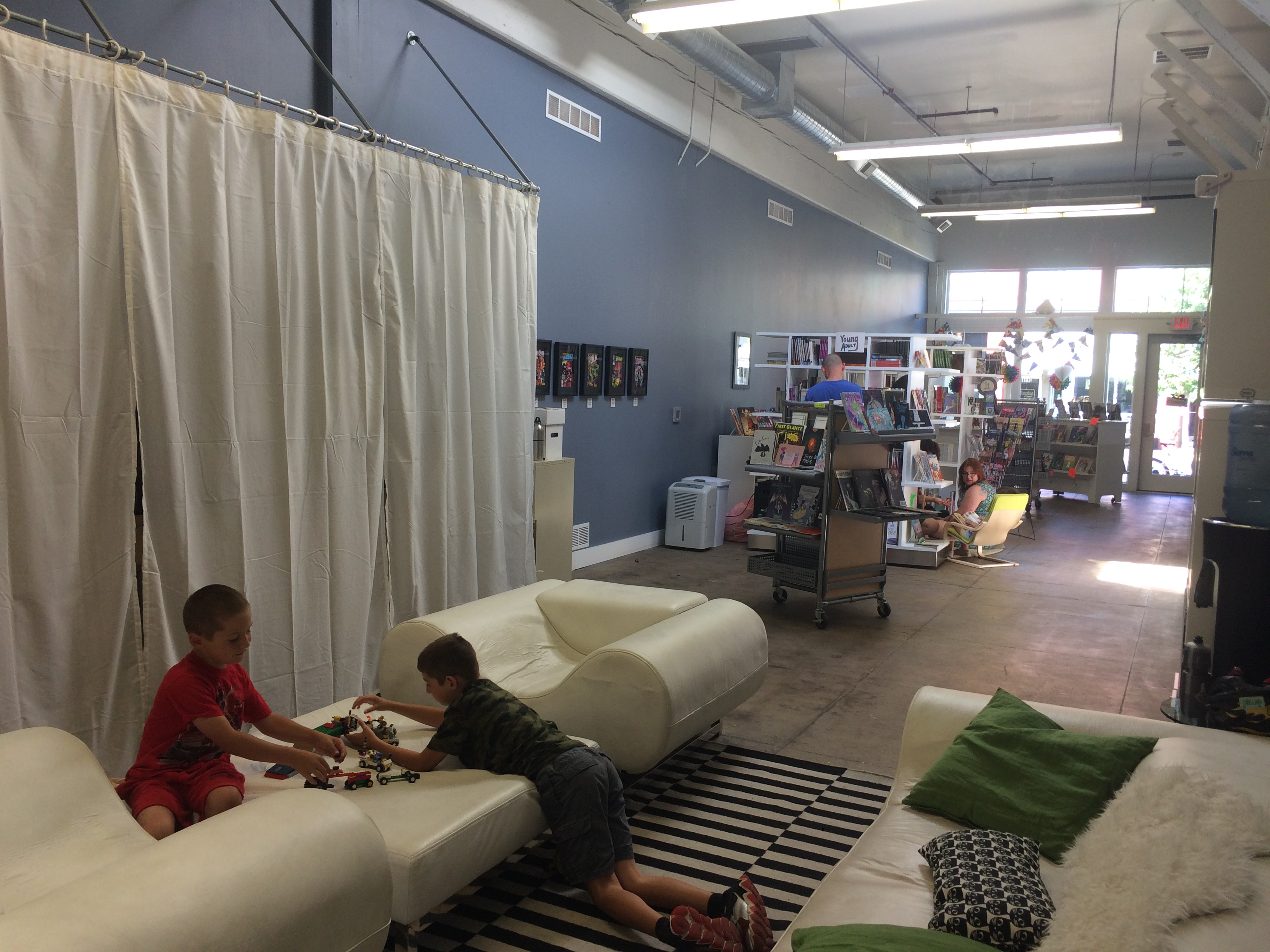 Then we visited Books with Pictures for comic books and to visit owner Katie Proctor, who is wonderful for a lot of reasons, but I find most notable for the awesome wooden boxes on her Yuba Mundo longtail cargo bike for holding an infant carseat. The store is new, this was my second visit and the kids’ first. Apparently the block was an auto body shop before so there’s no curb, just a block-long driveway. Which means no bike racks yet, until the curb goes in. But this is Portland so I bet that will happen soon. And the building is pretty and modern with AIR CONDITIONING which was really nice on this hot day. Katie arranged the front display with books all set in cold or watery places. How fun!