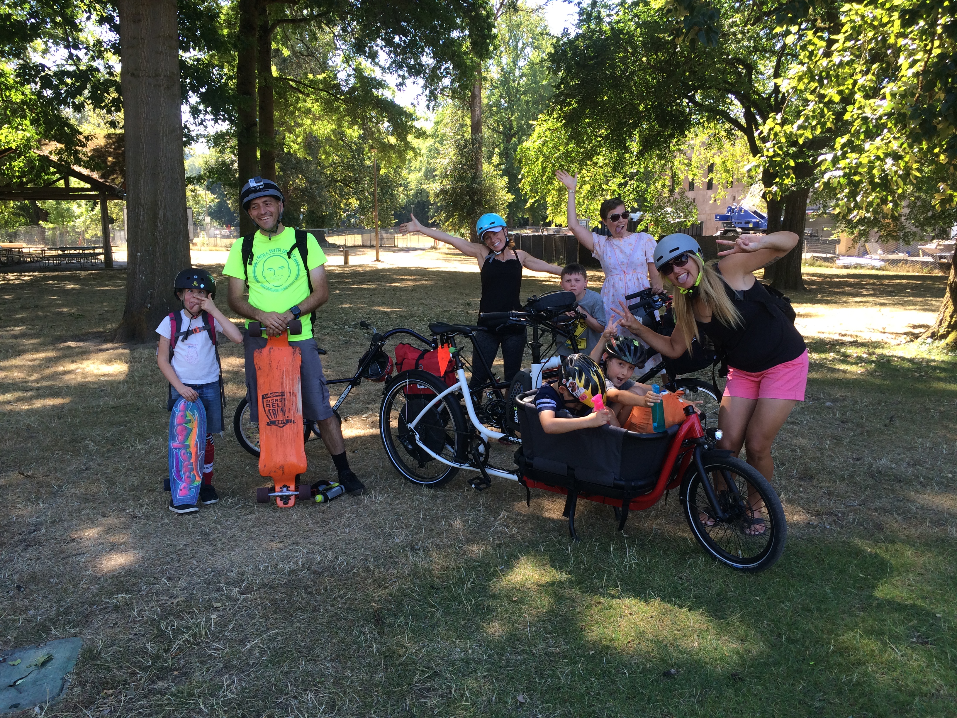 It was extremely hot out so our group was small: we three on our Douze, Ginger with her visiting sister and one of her two kids on her Circe Helios tandem bike (from Clever Cycles) with Burley Piccolo trailer bike, and Cory and daughter on their longboards.