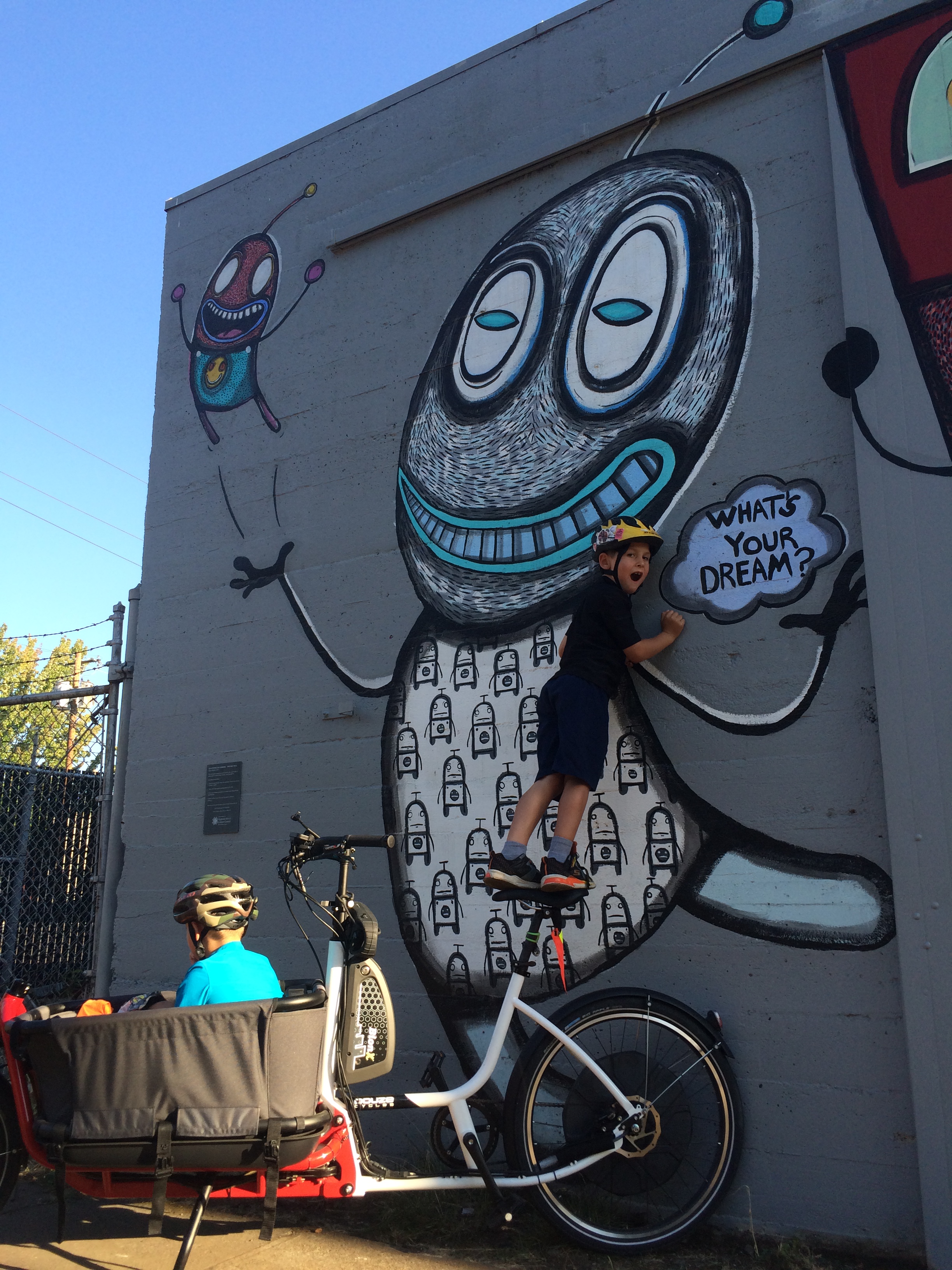 We meandered home via the grocery store and a few murals. This sort of bike makes it particularly easy to stop and check out mural after mural without the kids getting impatient.