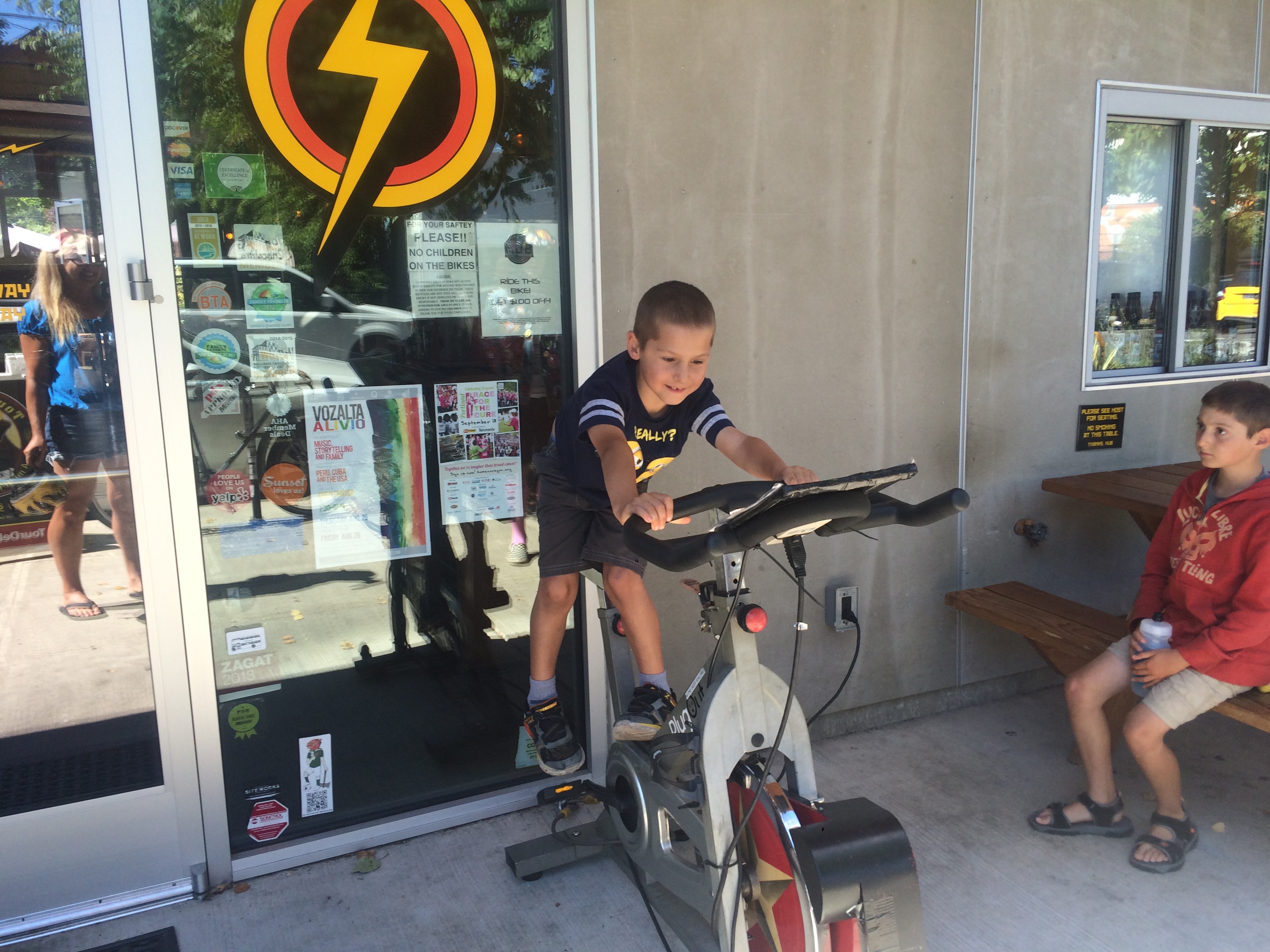 First up was another bike shop visit–Metropolis Cycles–and another cargo strap purchase–Surly Junk Strap this time. But we were really there because the kids decided I needed a bell and Metropolis was on the way to Dawson Park which was on the way to lunch with friends at Hopworks BikeBar. BikeBar is awesome for kids and adults alike. Lots of outdoor seating, as well as a little play kitchen. And there’s a stationary bike out front for powering the restaurant…though kids aren’t supposed to pedal it (shh!).