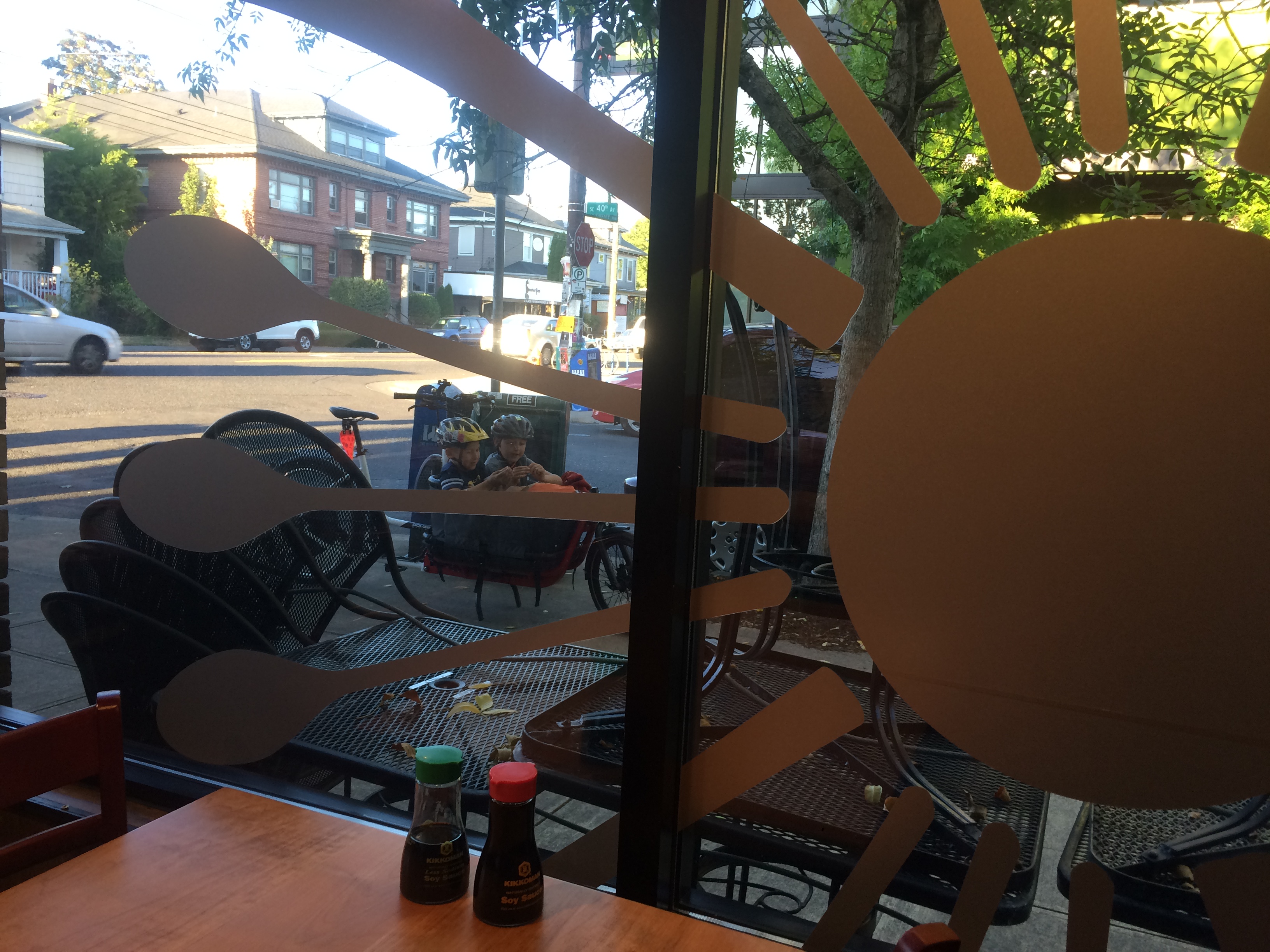 I took advantage of having a box bike for our last stop of the day and left the kids idling outside while I picked up to-go sushi.
