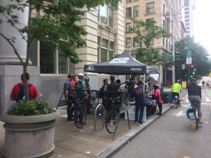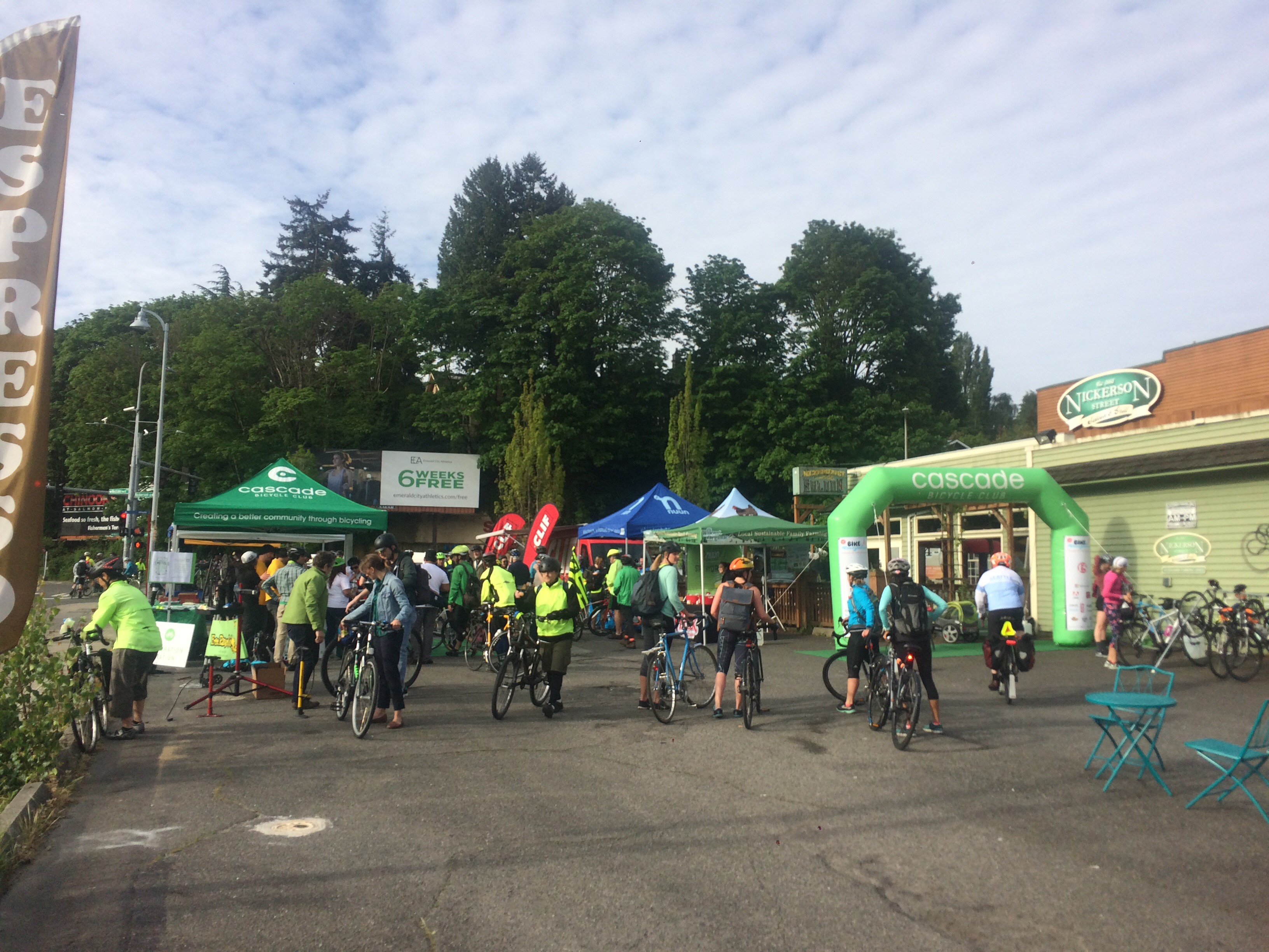 As someone without a regular job and regular commute, I love that Seattle’s Bike Month has become Bike Everywhere Month and Bike to Work Day is now Bike Everywhere Day. Our first or second Bike to Work Day in Seattle, I biked over to Gregg’s Green Lake with a baby and toddler and a volunteer from Cascade Bicycle Club said I obviously wasn’t on my way to a real job and didn’t want to give me a half banana. I think she gave me one anyway, but made sure it was clear she was doing me a favor. But now! Now there are tons of stations and everyone is made to feel welcome.