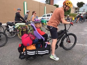 Nowadays my main bike is a Surly Big Dummy, one of several longtail cargo bikes available these days. It makes it easy to carry both kids and stuff. One things exceptionally terrific about longtails is that they make it easy to carry kids and their bikes, so I can carry the whole show through sections I don’t want the kids riding on their own or give them lifts when they get tired. The bike weighs about 75 pounds and is geared for hauling weight. The kids weigh about 70 and 55 pounds, but fortunately I rarely have to carry them these days. Toting one kid and his bike is fine, but they have hit a combined weight that I prefer not to carry.