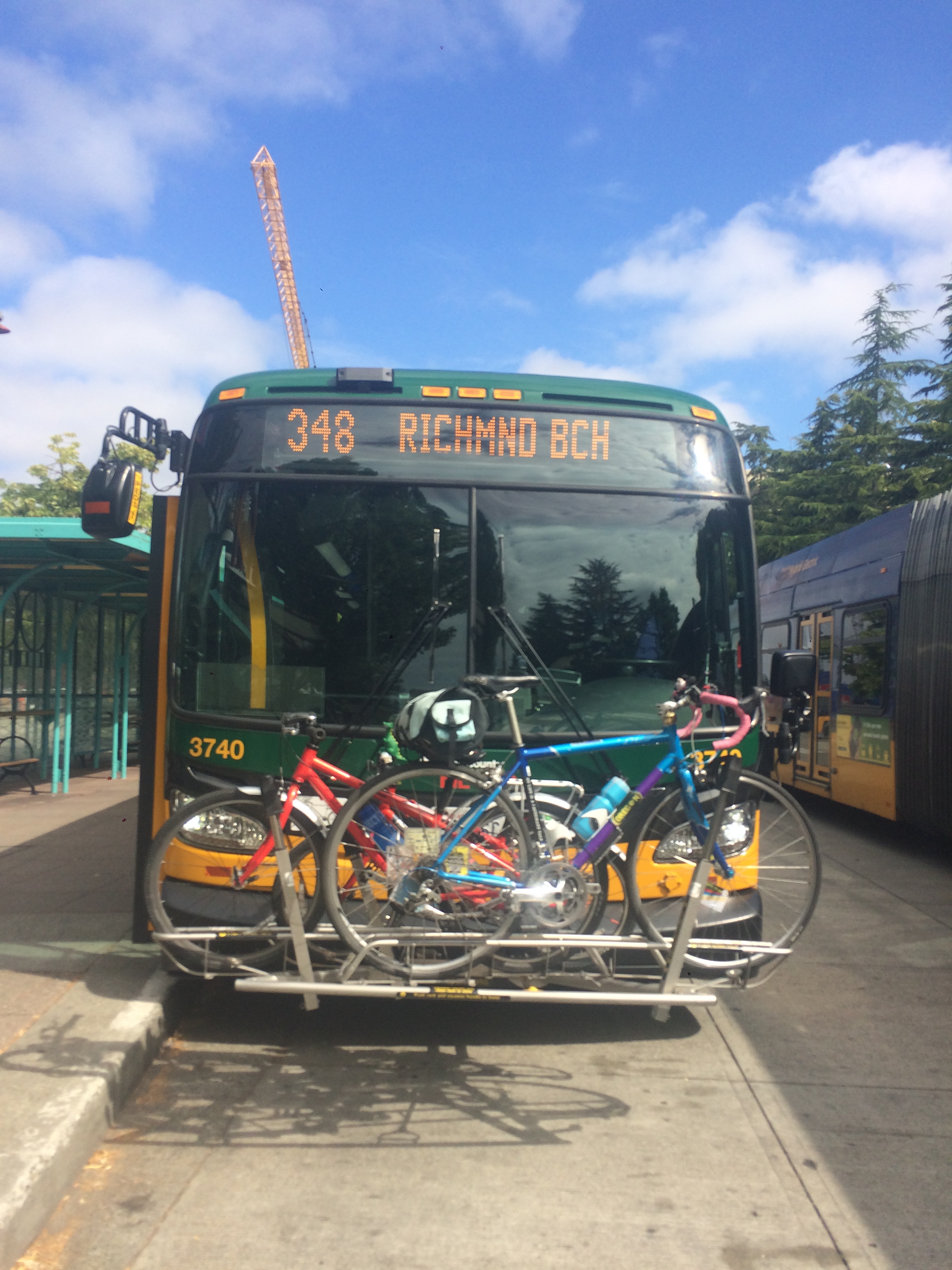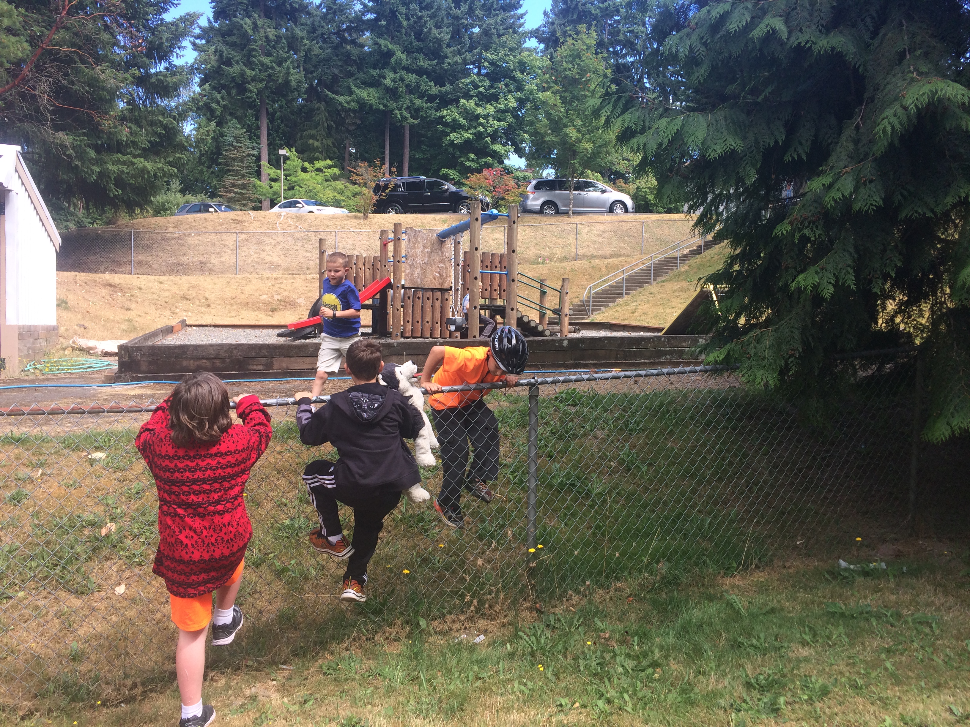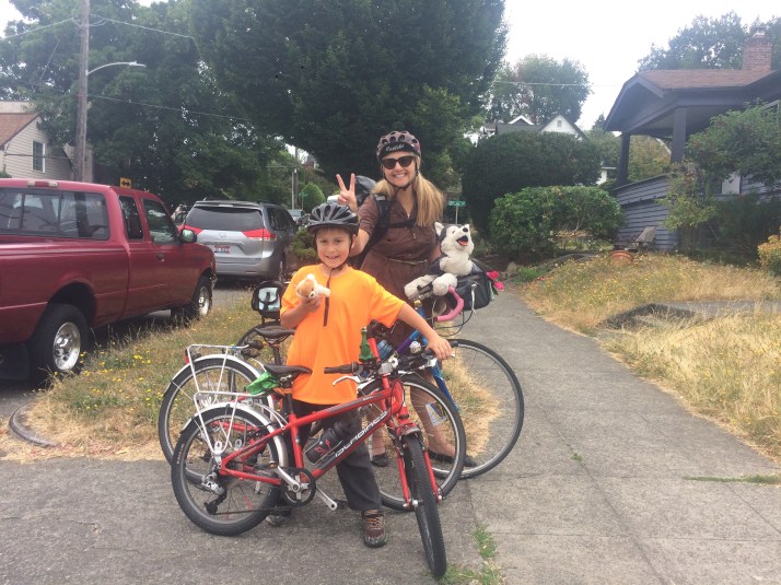 Paying for the bus proved a little confusing. I asked our driver on the first bus (when it was just us three) if I could tap five kids on one ORCA youth card (I know you can do this with ORCA adult cards) and he said they were really just for one kid. So I asked what the price for each extra kid was and was told it’s 50 cents. Um, no. I know that’s not the cash price because there’s a great Summer Youth Program giving kids free ORCA cards and charging all youth paying with ORCA only 50 cents. Finally he shared that cash youth are $1.50. Which I really should have looked up, but I was sure we’d be able to tap them all on one card. So I gave my oldest our three ORCA cards and $6 to pay for us all while I put the bikes on. Except everyone had to hold something so three someones had ORCA cards, someone had a five dollar bill, someone had a one dollar bill, and someone was sadly empty handed. Probably the birthday boy’s big brother. I wish I had thought to bring six one dollar bills. I forgot how fun it is to feed things into the bus till. By the time I had racked the bikes and climbed the steps into the bus, I came upon the end of some confusion. I’m not sure what happened, but the driver had the kids keep the cash and I think she tapped them on my adult card. Or maybe she just let them on free? This led to a brief moment of excitement by the two party attendees holding the cash over possibly keeping the bills, but I was able to get them back. The kids were very well behaved for our six-minute bus ride, though the driver stressed I wasn’t allowed to leave any behind on the bus. Heh.