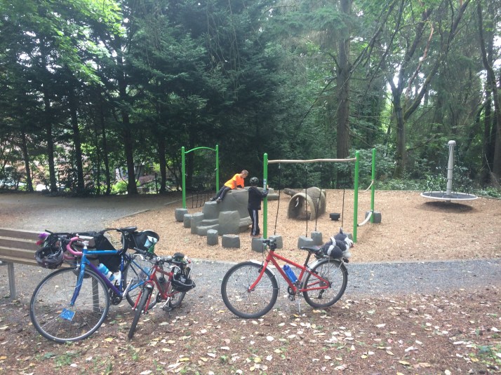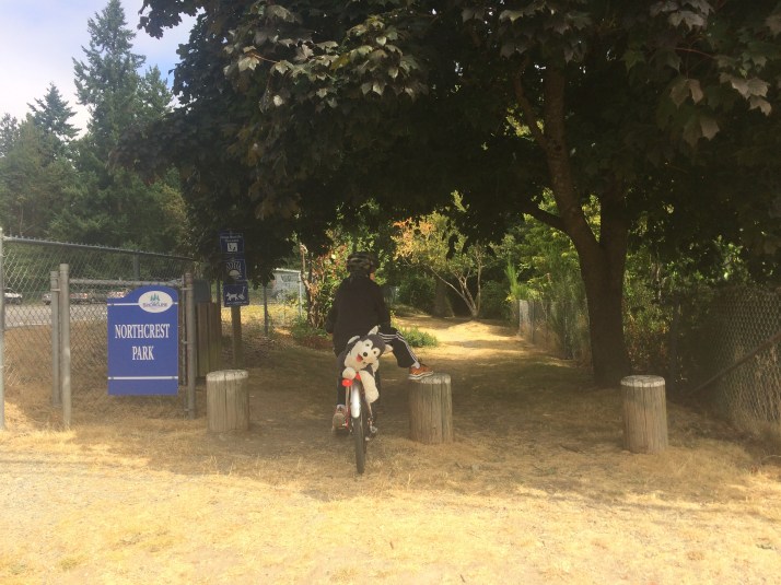Our starting park was Northcrest Park and it was great! We took two buses to get there and it took about an hour…which is probably quicker than it would have taken us to bike there (Google maps says 59 minutes, but Google maps doesn’t bike with two kids). We entered at the south of the park and biked along a great trail a quarter of a mile long to get to the playground at the north end of the park.