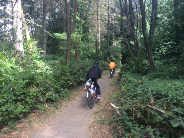 I hadn’t realized this Shoreline Menchie’s is the one right on the Interurban Trail! I think riding from the trail the two miles to the movie theater would have been hilly and unpleasantly busy, but only riding along the trail in the south/downhill direction was awesome.