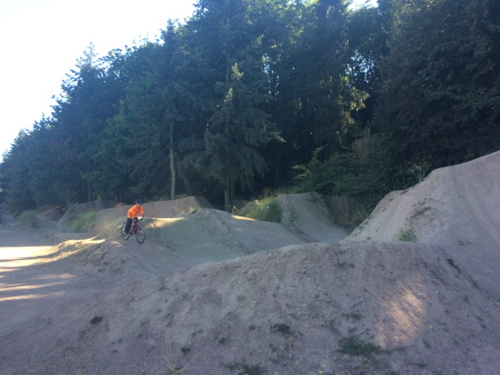 It’s still a longer ride than we usually take and we stopped for a few brief rest/water breaks. We opted to come over the top of Green Lake on our way home (we usually go south of the lake) and contemplated stopping at the wading pool to get our feet wet, but the kids decided they would rather rush home…that is, until we cruised by the dirt jumps in Lower Woodland Park.