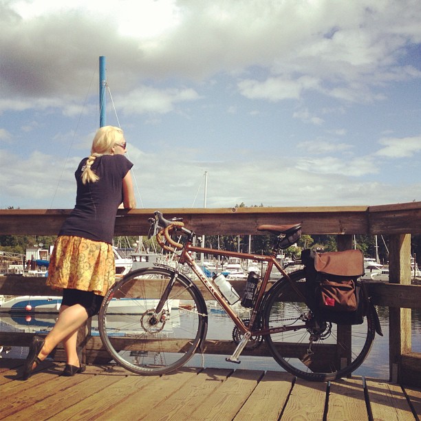 I started a blog post about that trip, but never finished it. I don’t think I discovered anything that I won’t write about for this new trip other than: consider not doing a big trip on a bike three sizes too big because it might really hurt your back. And wash your old water bottle out well because you can food poison yourself–which is really not fun on top of an aching back. Here’s a photo from that trip. I also learned brown bikes with brown panniers don’t photograph well in woodsy settings.