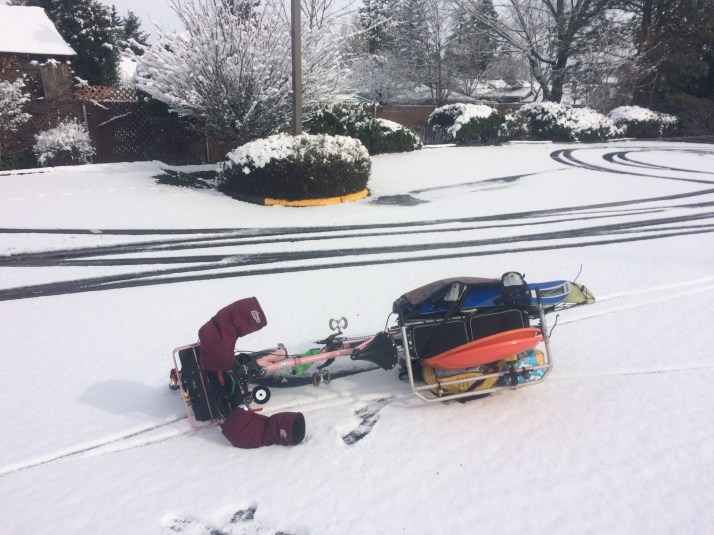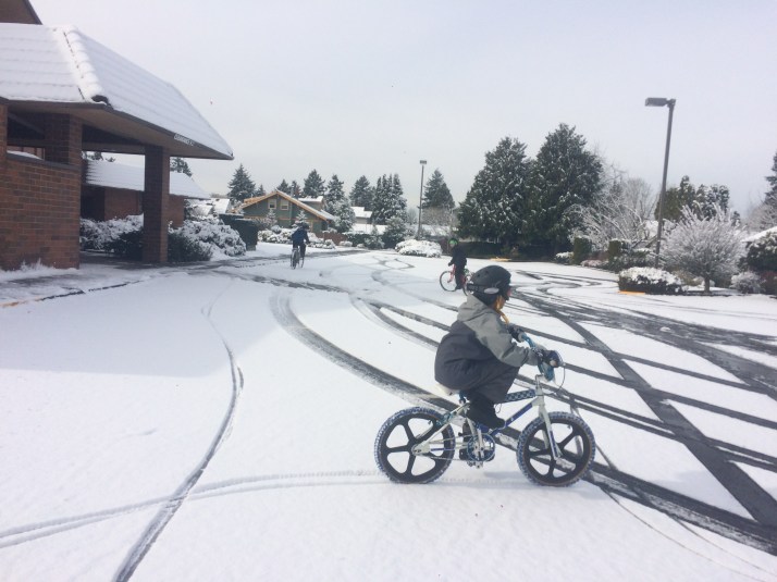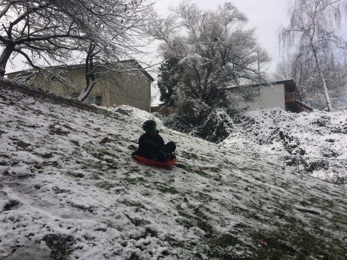 Wednesday we brought a neighbor (and his two saucer sleds!) and our two kid snowboards to the closest hill. In our hilly Seattle neighborhood we could just turn the corner and walk up the block for sidewalk/street hill or bike half a mile for a grassy hill, but nowadays it’s a bit over two miles to a park with a decent hill. I think the 10-year old stayed upright the whole time (he’s the slow and cautious one), but the rest of us each tipped over once.