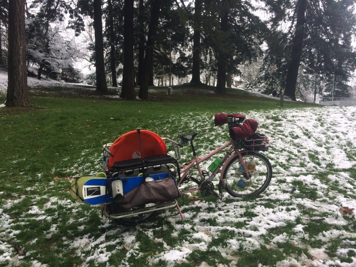 Tuesday we took our usual route to school while snow fell and stuck. I was initially worried about the unpaved blocks, but the gravel was easy to bike over and the potholes turned into picturesque lakes. No one else biked to school :(