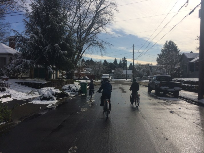 It’s been snowing! Pixie and I came down to visit Portland last year during soooooo much ice and it wasn’t all that fun, and it made me very glad I didn’t have to cope with 10 no-school days. This spell was a nice little three-day variety pack: Tuesday’s mild snow meant school let out two hours early, Wednesday was a properly snowy no-school day, and Thursday was a slushy two-hour late start.