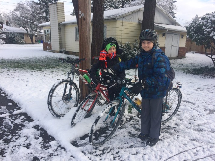 Thursday’s two-hour late start was great because there was very little car traffic and the roads had warmed up a bit so there was only snow and slush, no ice. I was worried our usual gravelly route might be icy and take too long (why having two extra hours to get to school makes it harder to leave on time, I’ll never know!) so we rode a couple blocks of sidewalk along busy roads (avoiding those two busy blocks is why we ride six blocks of gravel normally). I took my mountain bike because I’m scared of snow and had errands to run all day. This meant the kids had to wear their backpacks–a rarity and they didn’t complain! One other adult bike was at the racks.