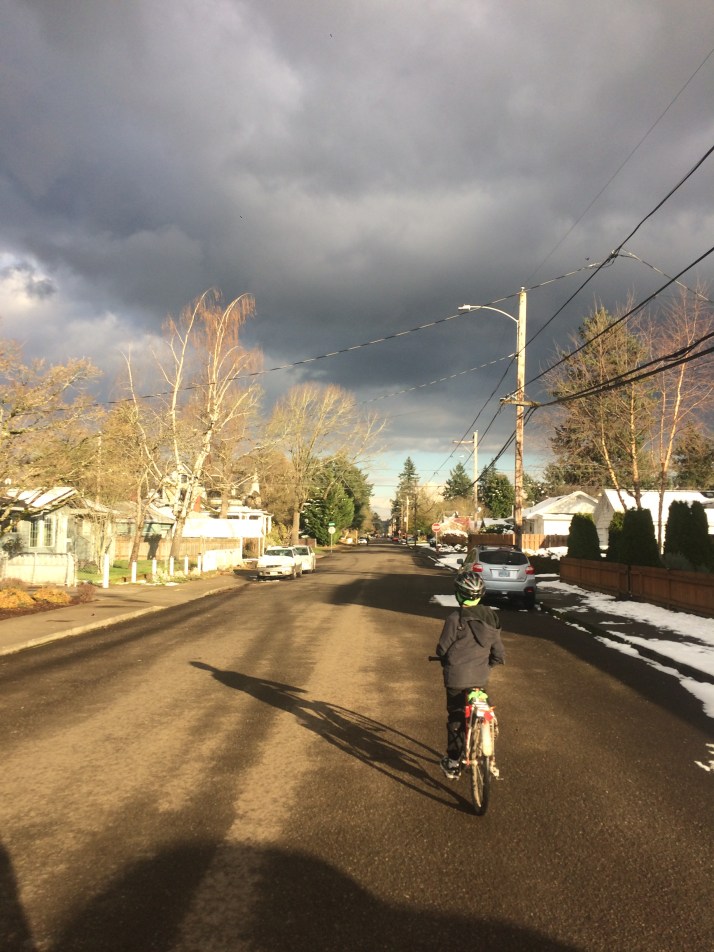 Snow fell as we biked home, but just a teensy bit and it didn’t stick. The roads were clear so I took my cargo bike and carried all the stuff. The sky looked amazing, by the way.