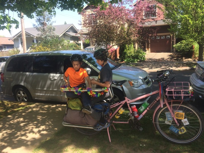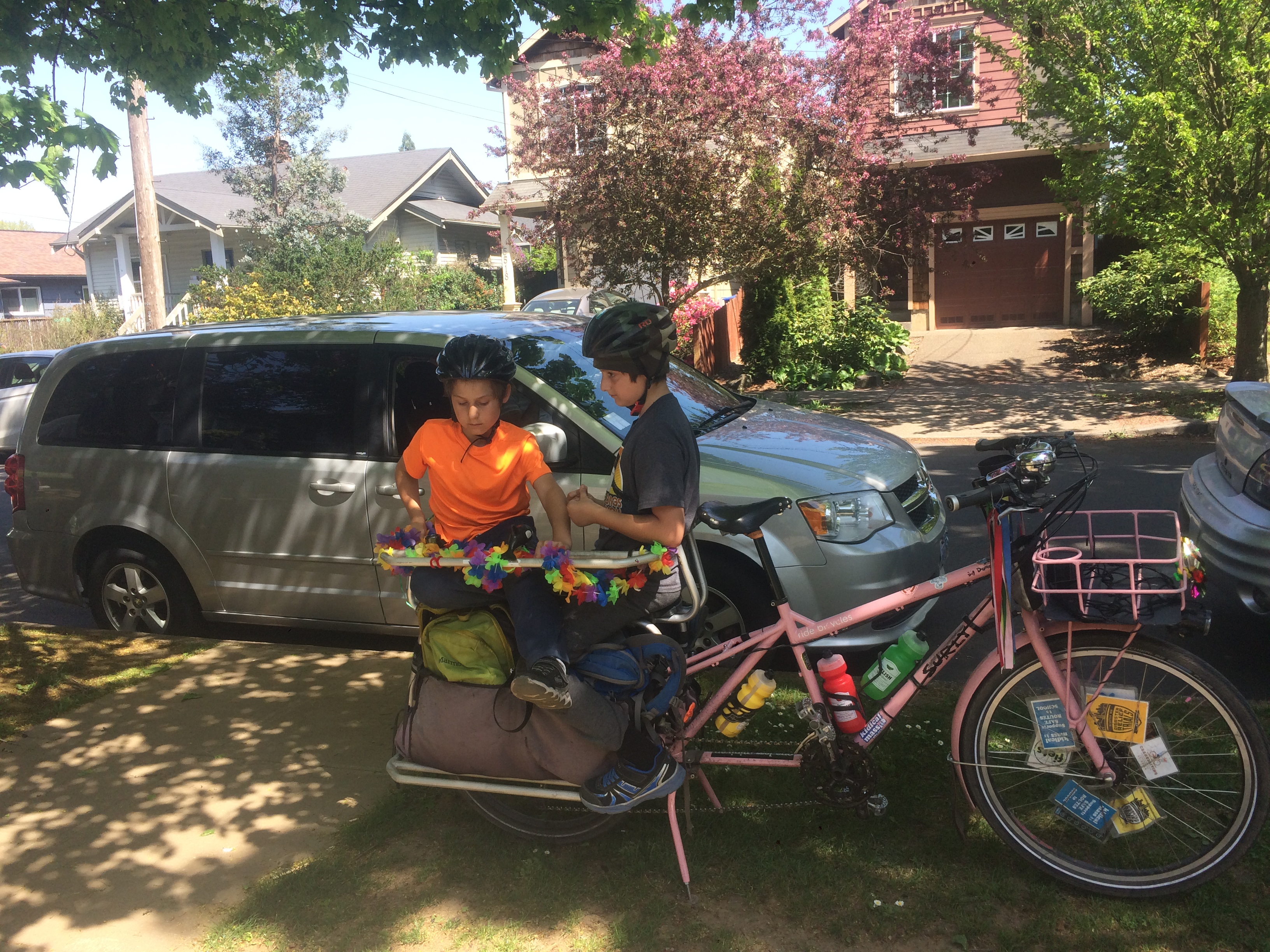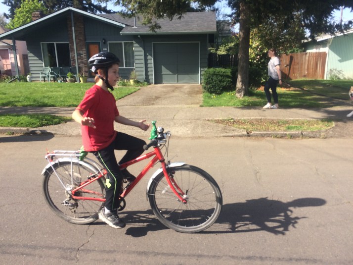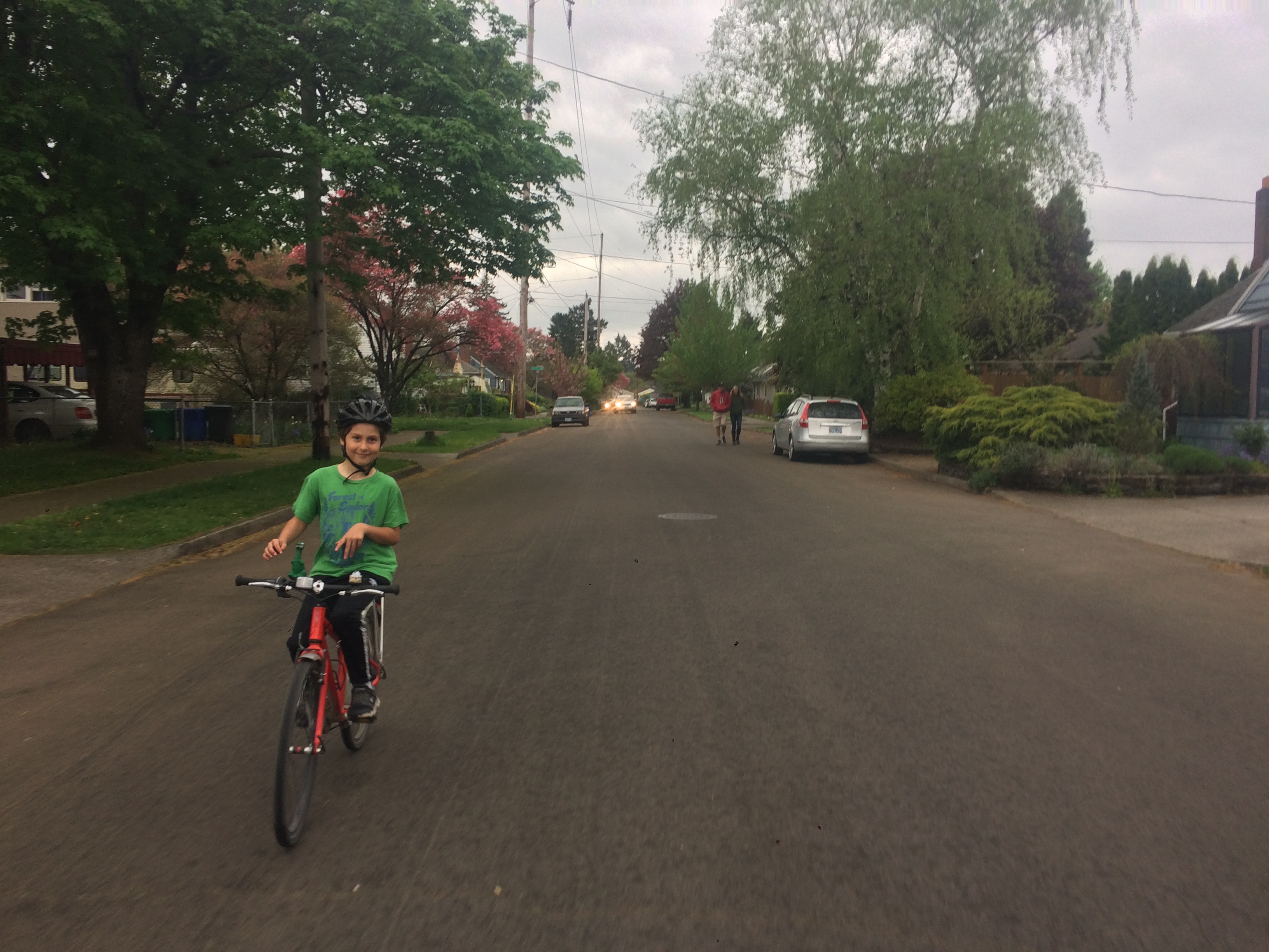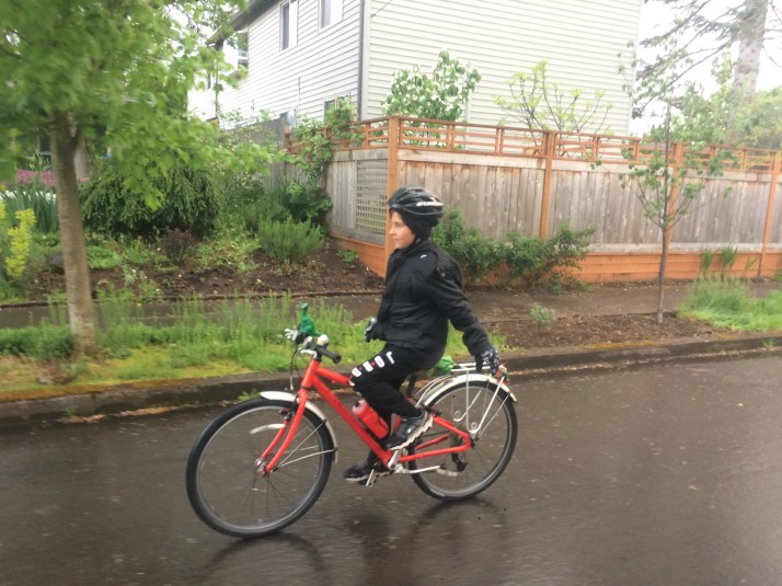 And the little one is back to riding no-hands again. I momentarily got him to agree to keeping hands on the bars in the rain, but that oath wore off. No falls, though!