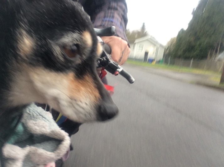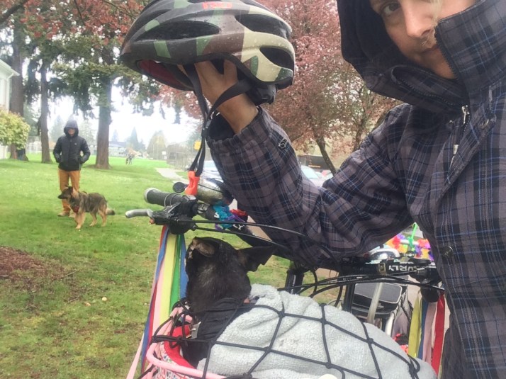 It was pretty rainy at school pickup and I realized I need a mini umbrella for Pixie. And then my eight-year old came out with a delicate art project and I realized I also needed a box. Before I could figure out what to do he and a friend had set up a playdate at our house and since I didn’t have an extra helmet for the friend and we couldn’t walk like we usually do with my other kid’s hurt foot (not to mention it would be pretty miserable walking in the rain) I told the friend’s dad to wait five minutes and drive to our house…with the art project. Win-win!