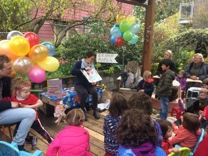 After the story time and Q&A kids decorated their bikes and Community Cycling Center organized a bike parade that I got to lead. After cautioning the kids to keep their balloon tails short so they wouldn’t get tangled up, I left my balloon too long and it snuck into all my pictures, doh.