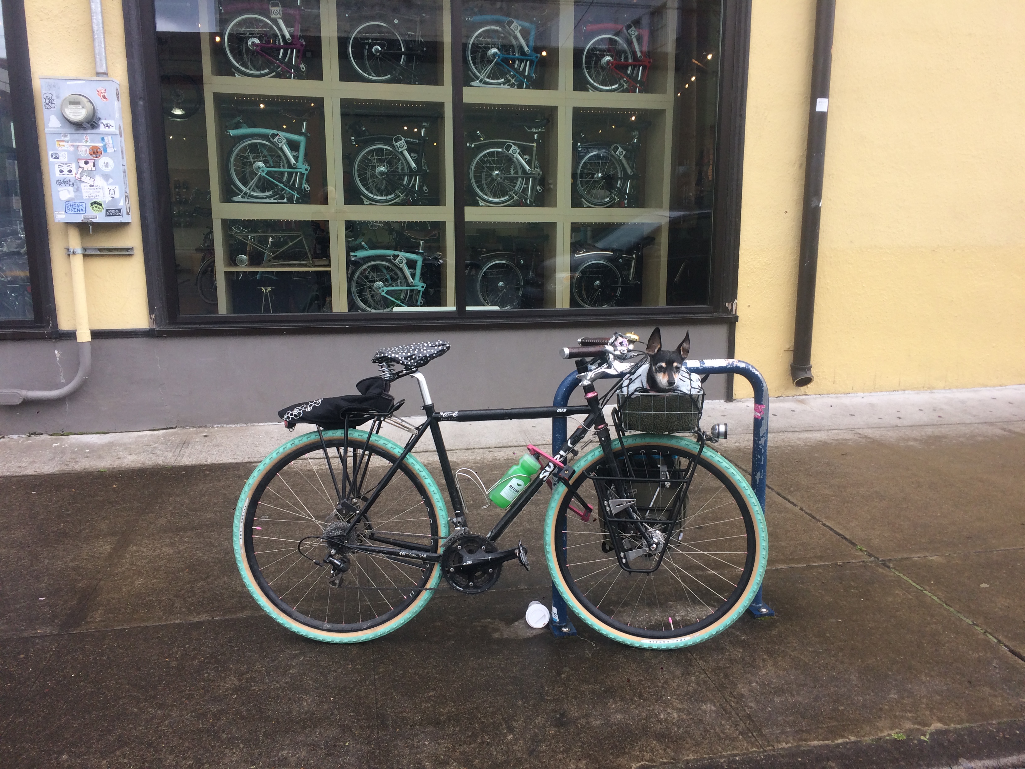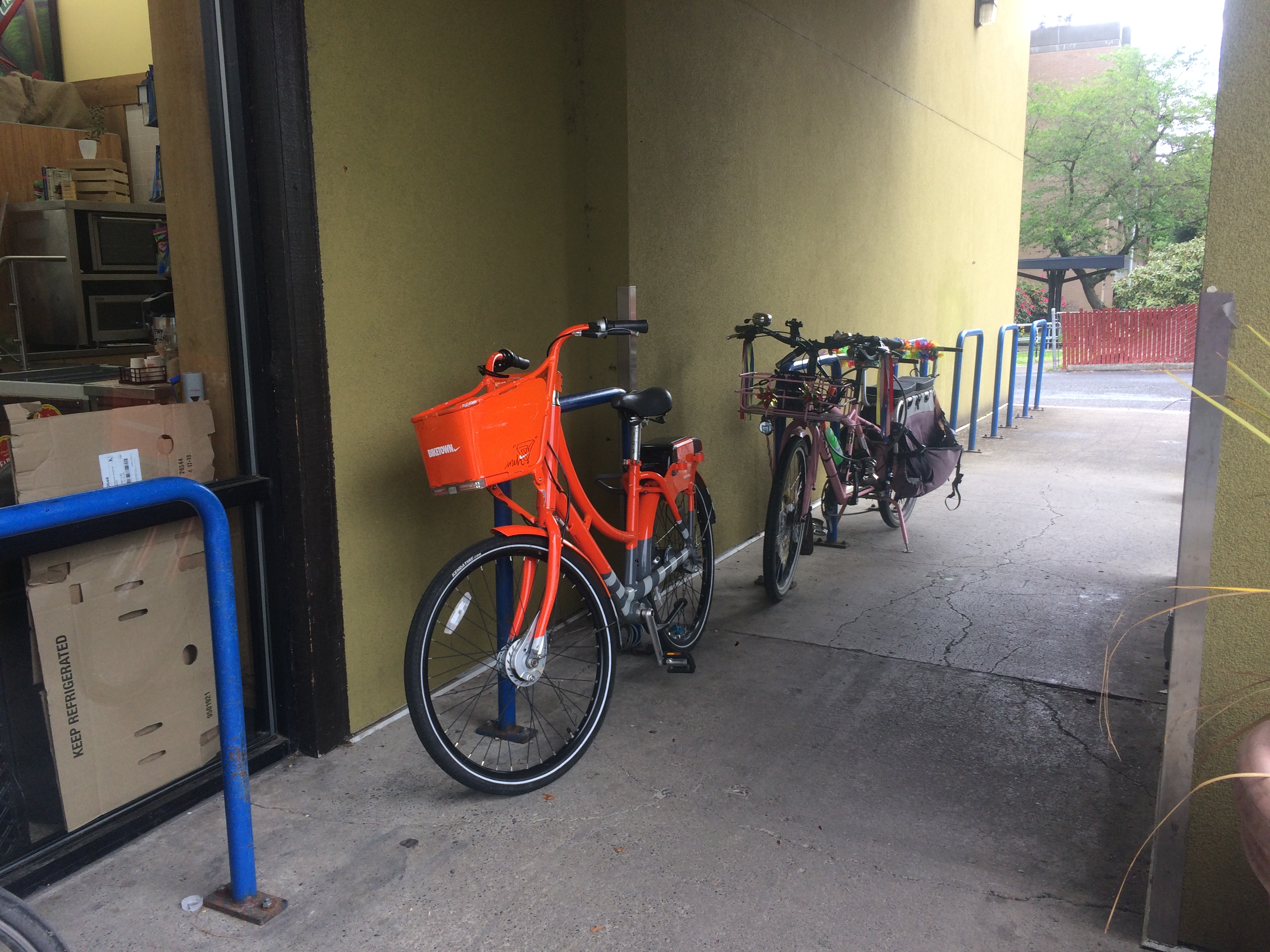 Last day of #30daysofbiking! I noticed I was sort of close to 600 miles for the month, but wasn’t motivated to do anything epic to commemorate the day, with the weather being icky and a writing deadline looming. So after bringing the kids to school and spending an hour making copies and hanging Walk & Bike to School Month tally sheets outside each classroom door, I made for a coffee shop with my laptop. I stopped by Trader Joe’s on my way home and saw a bike share bike locked to the rack. Pricey trip considering starting tomorrow bikes are free all month. Bike: Surly Big Dummy.