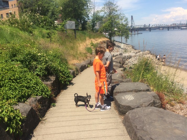 After lunch with the protesters we visited Poet’s Beach. I’ve been a few times myself, though never when the river was low enough to reveal the sand, and the kids had never been before. They loved the poetry. Actually, too much. It was so hot out and they had to stop and read every rock on our way down the trail before I could run under the shade of the Marquam Bridge.