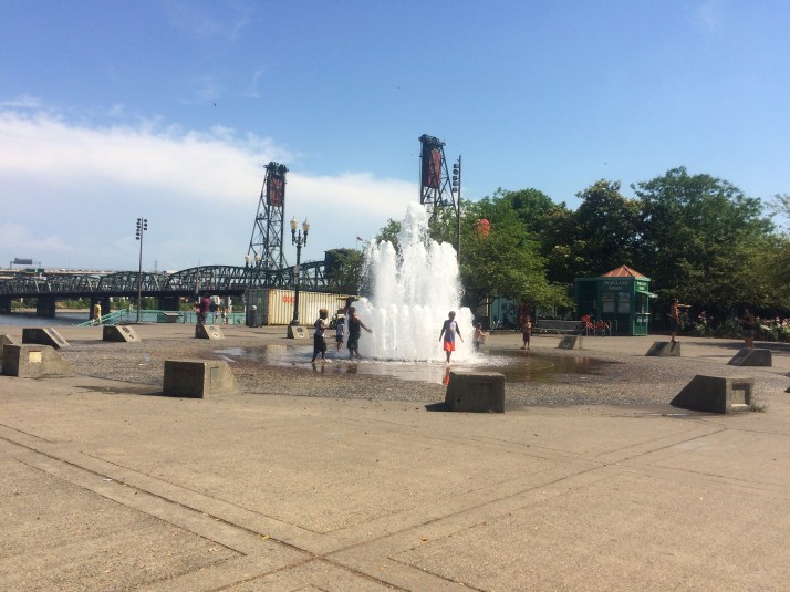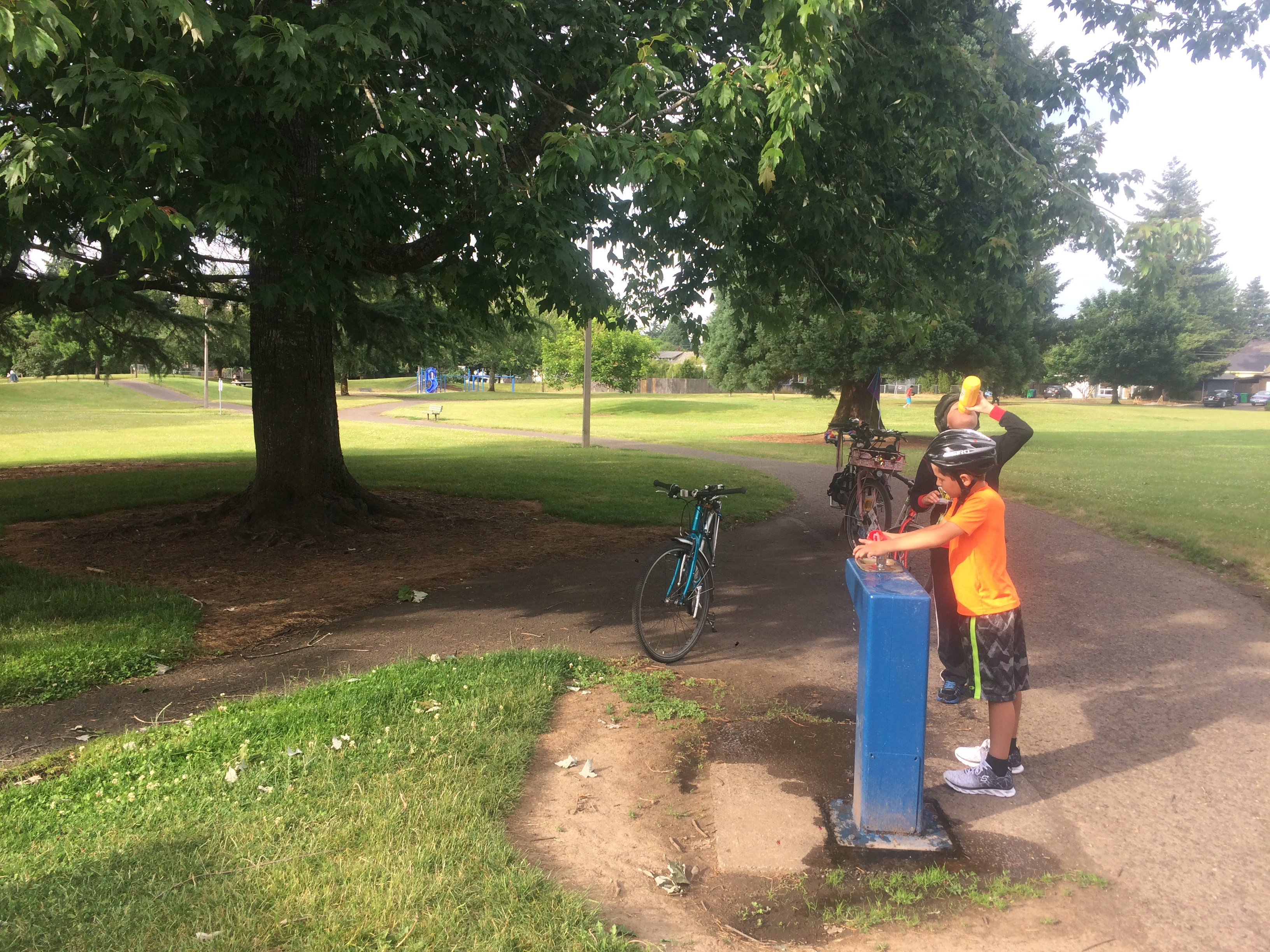 Since we had a long ride home and it was still hot out, it seemed wise to swing by a spray park to remove all the sand next. The kids remembered Salmon Street Fountain from the Kidical Mass PDX bridges ride two years ago. They still love it.