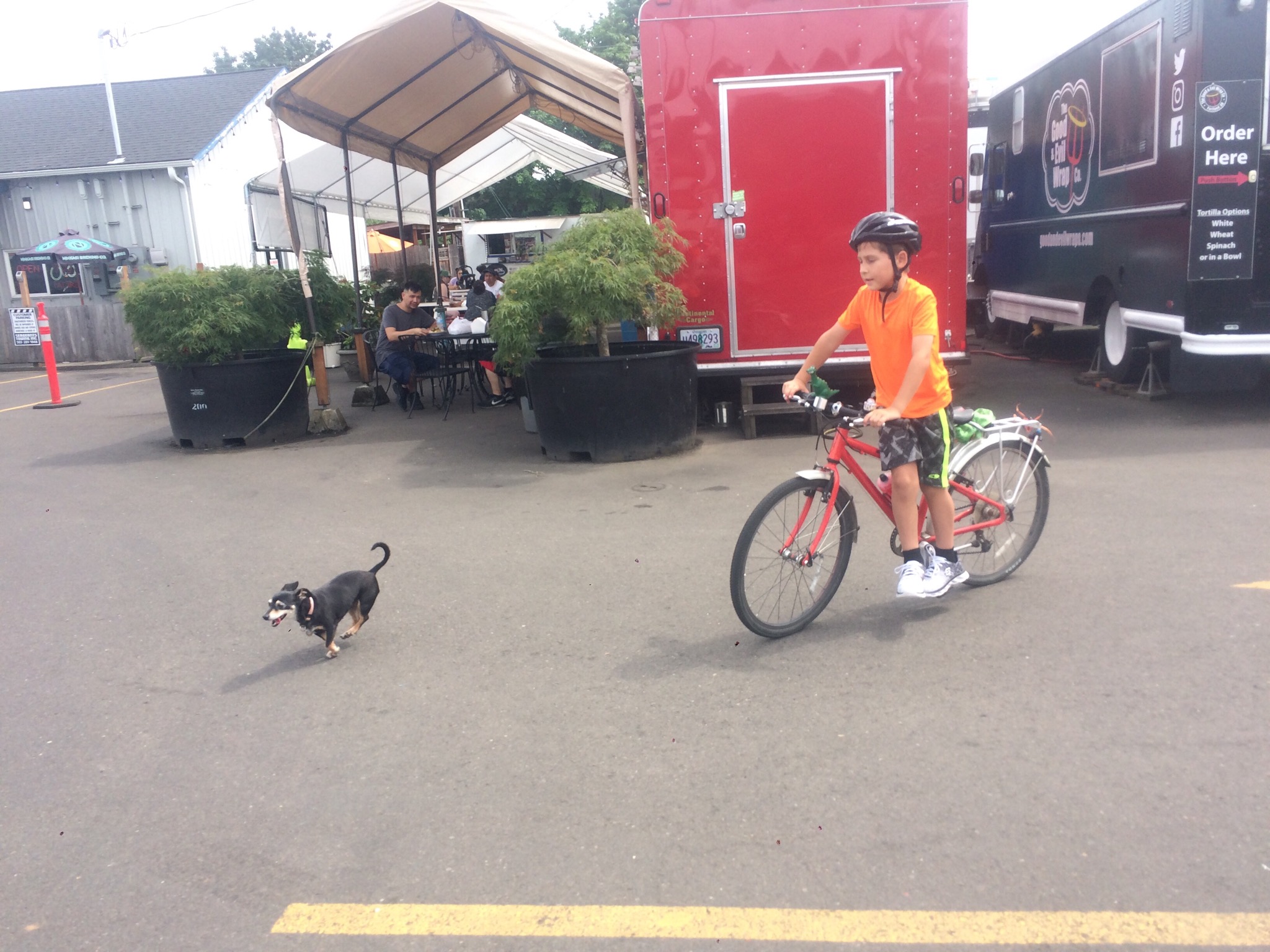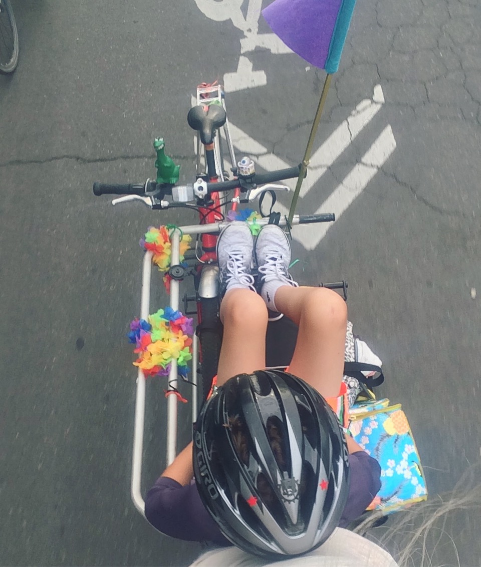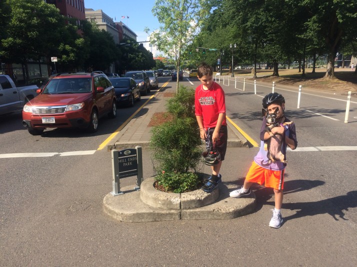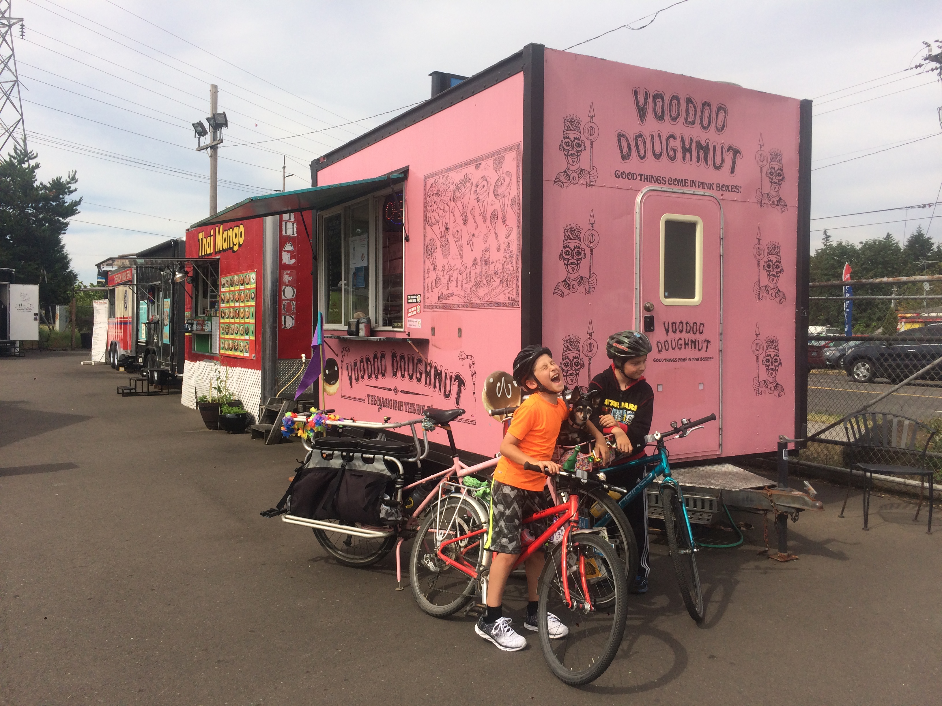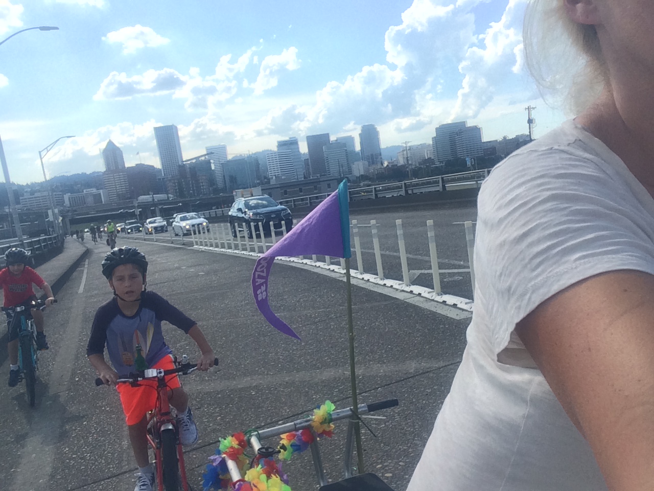 The kids were hungry again so we opted to take the Hawthorne Bridge and go to Cartopia Food Truck Pod. Food truck pods are so convenient when we have Pixie in tow. And when the kids are so hungry they end up eating from two different trucks each–options! I was relieved to find water at Cartopia as we hadn’t happened upon any drinking fountains and were just about through our six water bottles by then. I don’t usually ride the Hawthorne Bridge with the kids, I try to stick to Tilikum Crossing and the Steel Bridge since there are no cars. But they did great and my little one loved the bike passing lane on the second half in the street…though he didn’t utilize it to pass me.