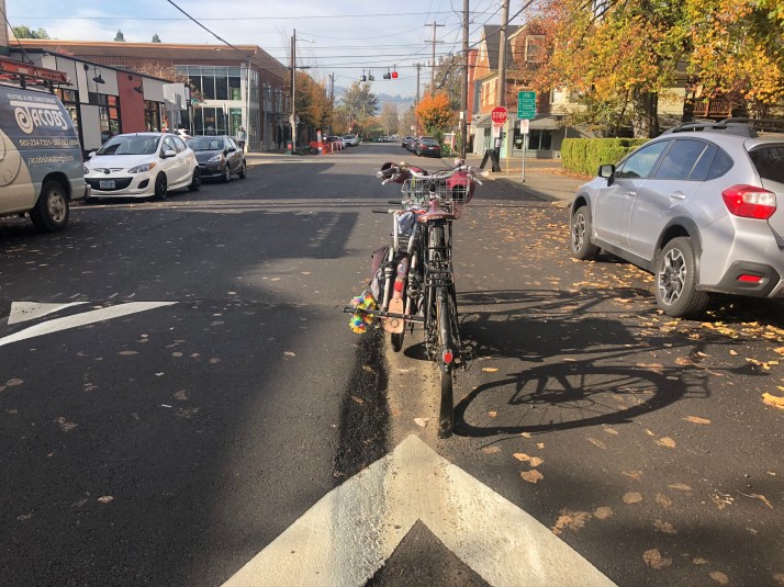 Even when I’m not riding with my kids in tow I imagine how each road I take would feel with them along. I take this one step further for any new infrastructure and wonder how all sorts of people would feel using it. In the case of these new bumps I immediately thought of trailers and trikes. Save some tilty cargo trikes and recumbent or semi-recumbent trikes, trailers and trikes like to stay level. Hitting the rut with one wheel at slow speed would probably cause an uncomfortable lean, but I think hitting it while traveling at speed would be jarring for a trike or trailer and possibly cause it to tip over. I’d really like to hear thoughts in the comments from trike riders and trailer pullers.