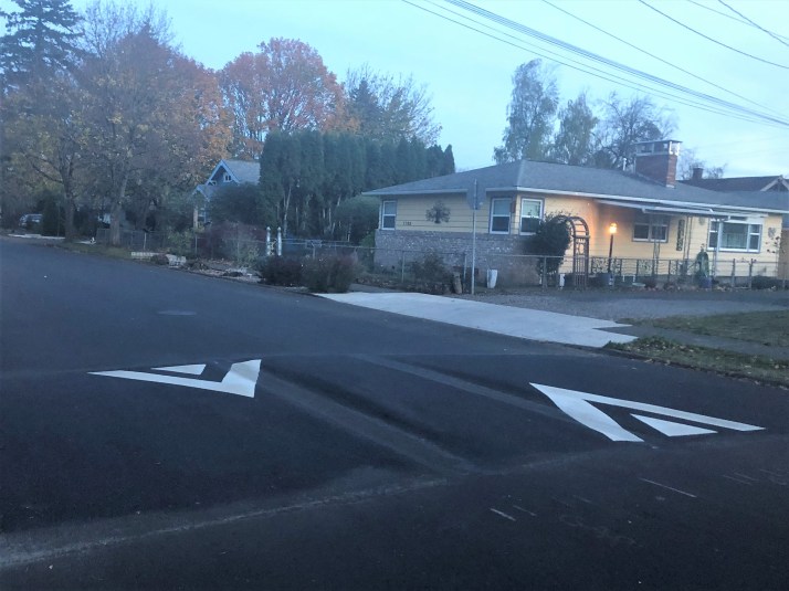 I’ve had a chance to ride on a road with these new-style speed bumps for a while now–before last month’s SE Clinton project over four miles of SE Harold (from 52nd to Foster) was repaved and decorated with these same bumps. Except I haven’t been using them as intended until recently because the installation left a lot of gravel in the ruts and it stayed there for a long time. I’m all for riding through the pebble- and rock-sized gravel on unimproved roadways, but I was too scared to ride through the sandy gravel in the ruts. I don’t know if this means they’ll collect grit throughout the winter, but it makes me suspect they will.