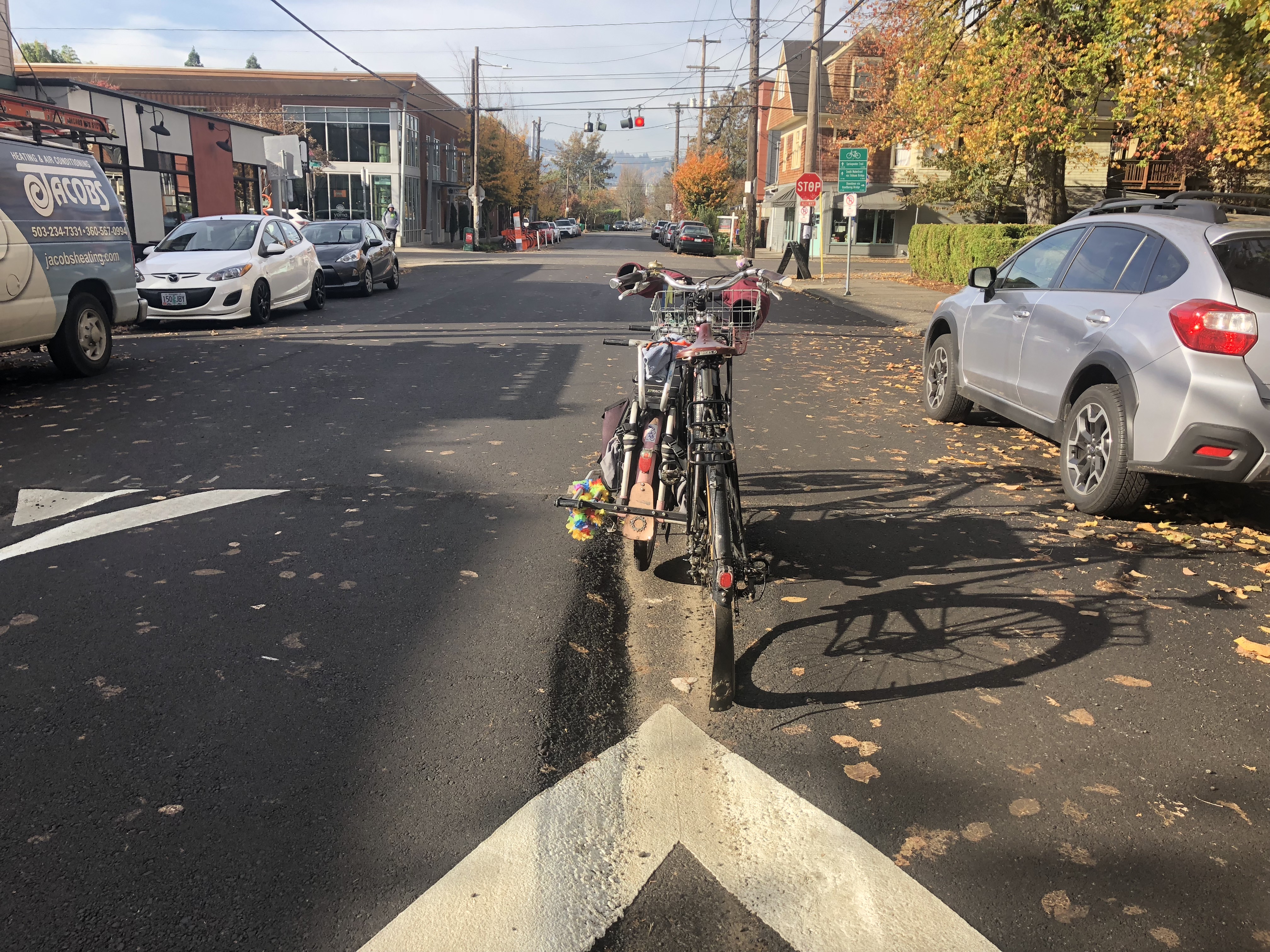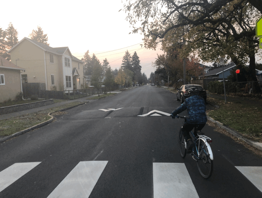 I’ve had a chance to ride on a road with these new-style speed bumps for a while now–before last month’s SE Clinton project over four miles of SE Harold (from 52nd to Foster) was repaved and decorated with these same bumps. Except I haven’t been using them as intended until recently because the installation left a lot of gravel in the ruts and it stayed there for a long time. I’m all for riding through the pebble- and rock-sized gravel on unimproved roadways, but I was too scared to ride through the sandy gravel in the ruts. I don’t know if this means they’ll collect grit throughout the winter, but it makes me suspect they will.