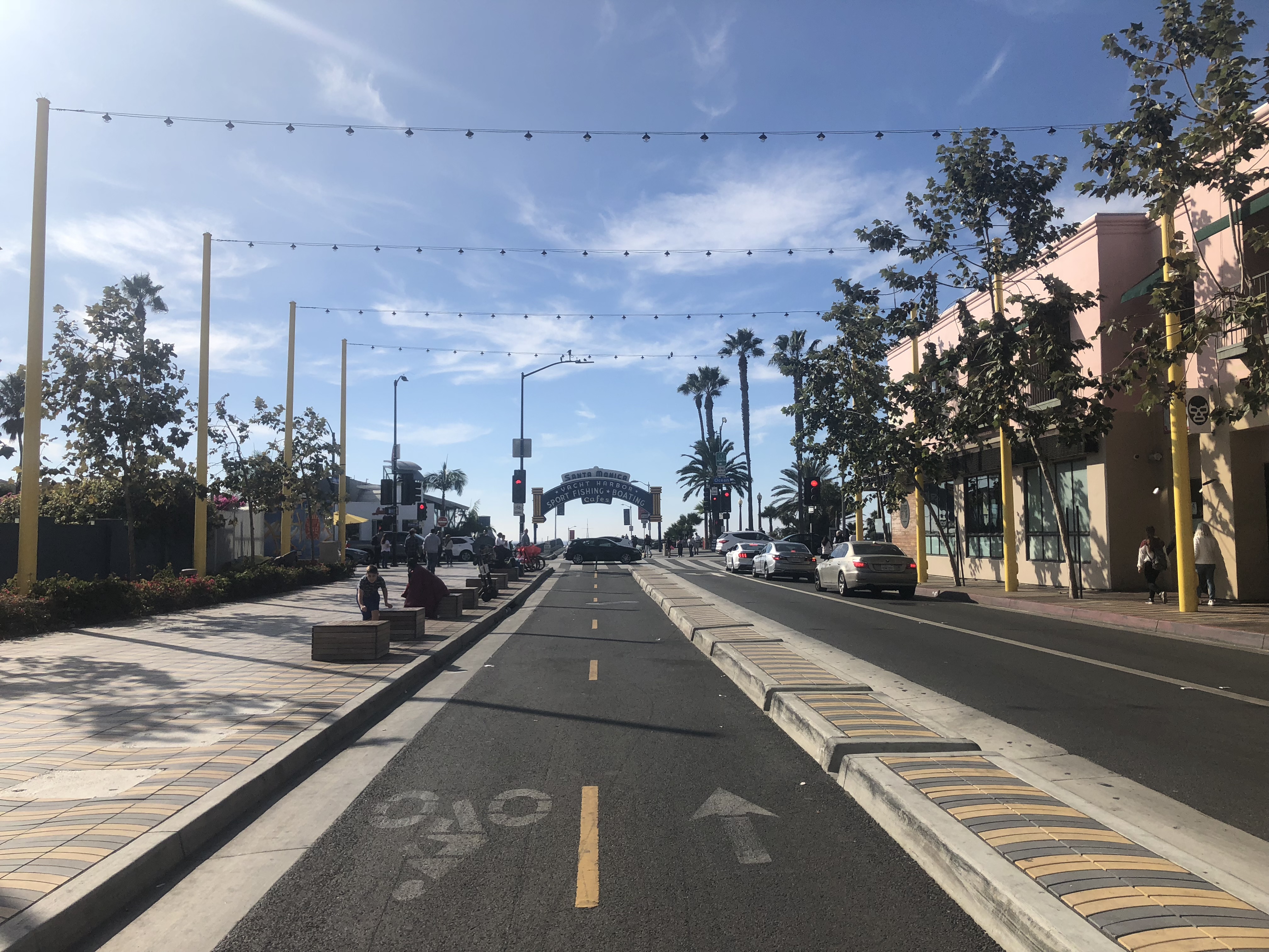 I’ve been to Santa Monica several times, though it’s been a while–our most recent visit included joining a Kidical Mass ride with Santa Monica Spoke five years ago (to which we traveled by rental car and borrowed a bike). Things have changed! We stepped off the train to see three (three!) different kinds of bike share bikes, several brands of e-scooter shares, and a protected bike lane connecting the train station to the beach. I was so excited I tried my TAP card on a Metro Bike, but it didn’t take (turns out I should have registered for bike share online ahead of time). I had entertained the idea of putting us all on bikes, then downgraded to an idea of two bikes and one e-scooter, then one bike/one e-scooter/one jogger, but in the end we walked the three short blocks to the Santa Monica Pier.