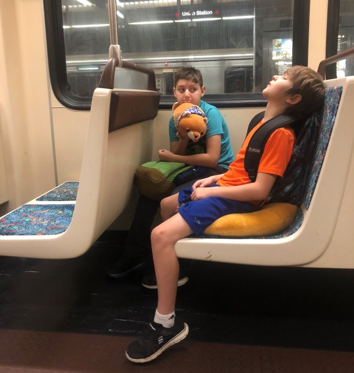 Carrying all our daytime stuff (snacks, water bottles, emergency Madlibs) in my messenger bag and sleeping on a hotel sofa bed left my back aching by the morning of day three. I recruited the kids to do all the carrying between their two backpacks so I fared well for our day of travel. Going forward I’ll stop being the only packhorse in the family as a preventative measure. Also, the kids (9 and 11) are able to carry more, walk more, and go longer between eating than I had given them credit for.