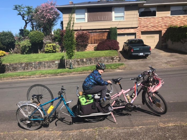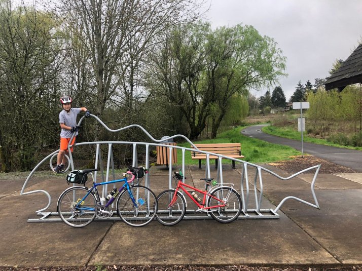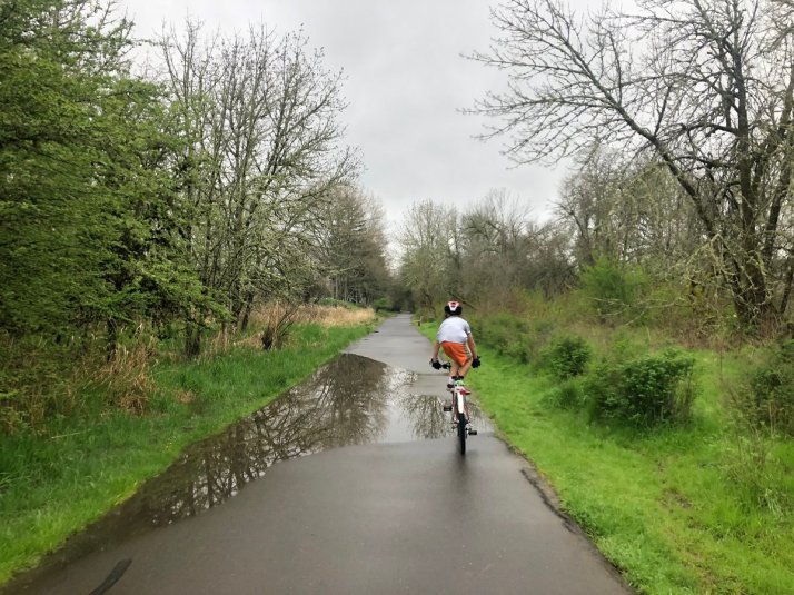 April 8th, while my 12-year old was away at Outdoor School, my 9-year old and I went multi-modal and took the light rail to Beaverton and biked to a trampoline place. Much of our trip was on the Fanno Creek Trail, but the roads on either side were huge and we had to stick to the sidewalk a lot. But we’ll be back, including the cheap and fresh sushi lunch spot in the strip mall next to the trampoline place.