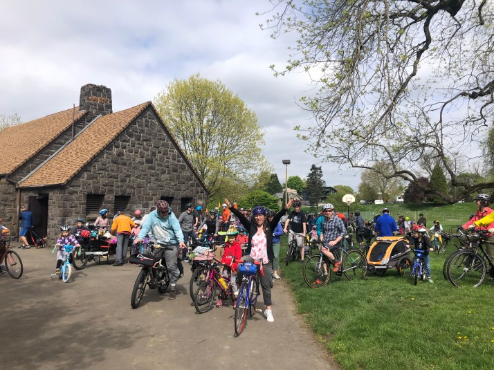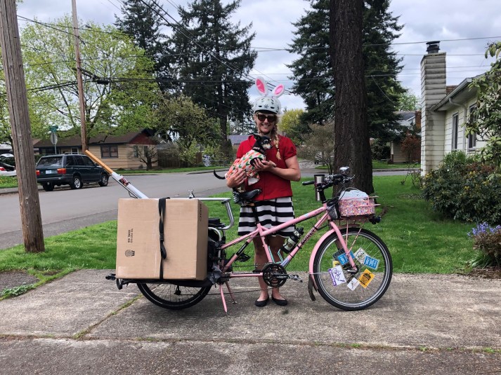 April 21st was the “opening day” of Kidical Mass season with our annual Easter Ride. This ride is always huge and this year over 300 people came! The ride is pretty far from home so I had originally planned to take a regular bike and pedal two miles to light rail and then catch two trains to get there because it was a bit far for the kids. But in the end I went solo so I could bike the too-big-for-light-rail bike the whole way there. This felt like cheating since I didn’t need to deal with the train nor did I have to figure out how to carry the Kidical Mass PDX banner with my regular bike.