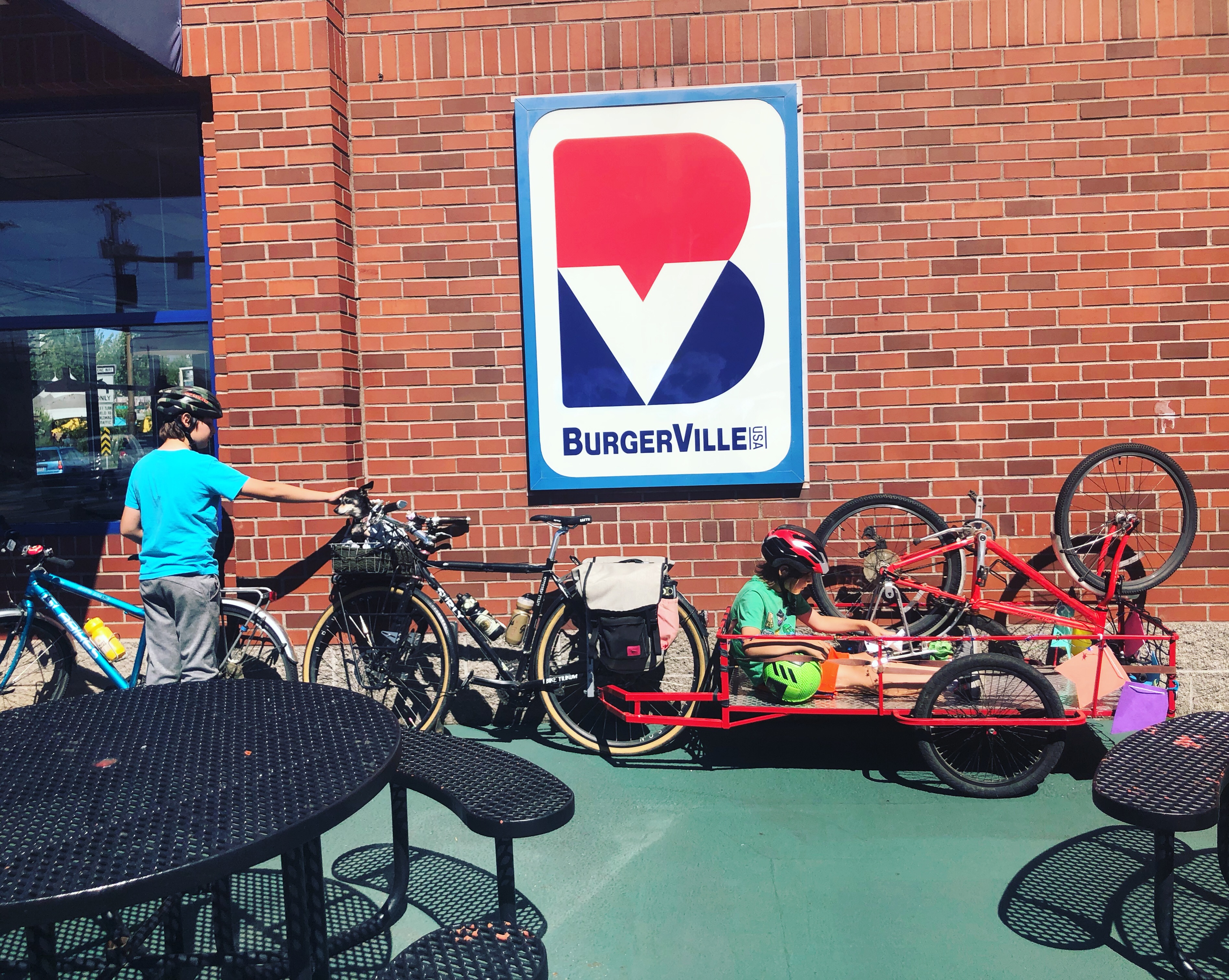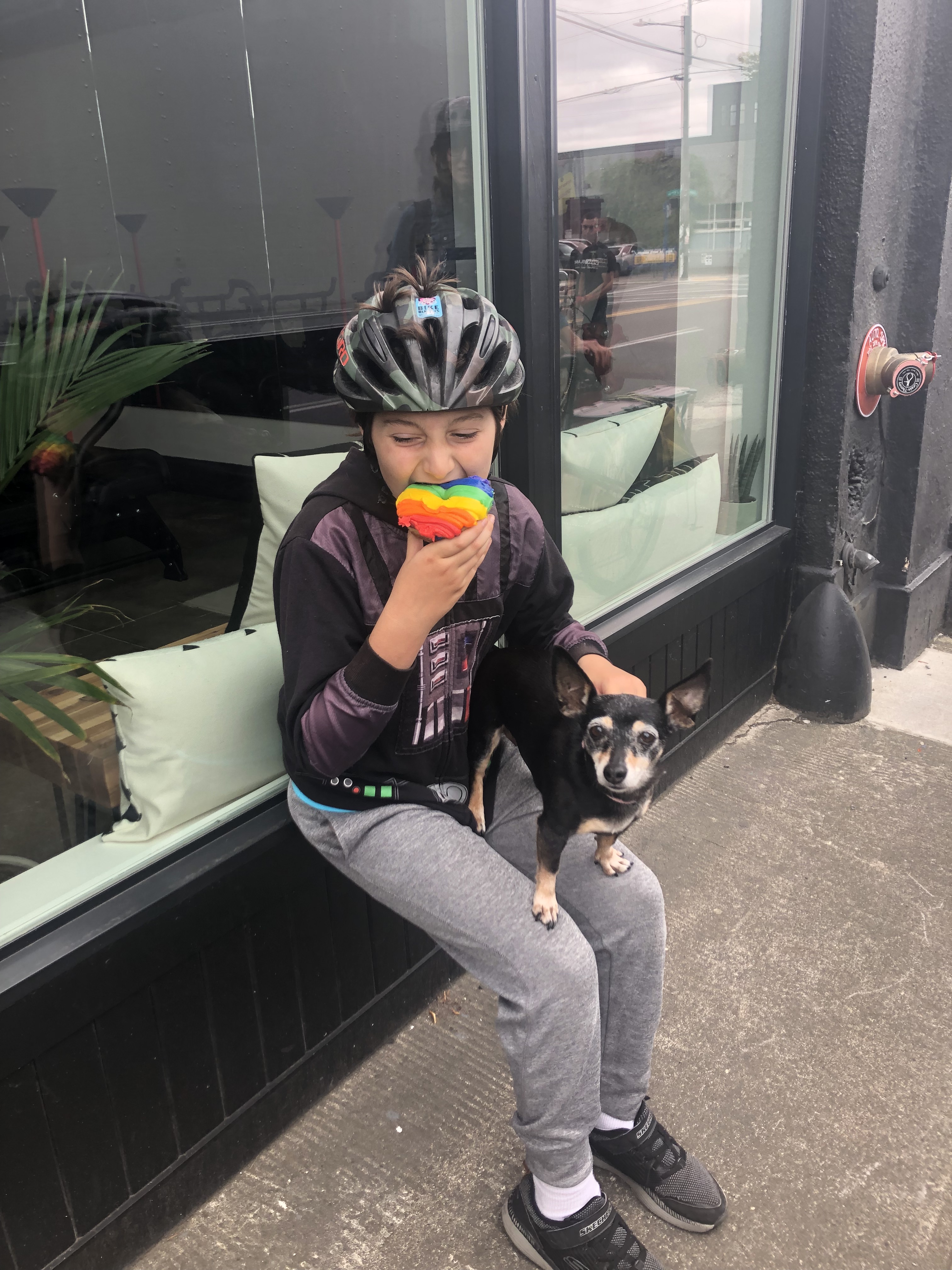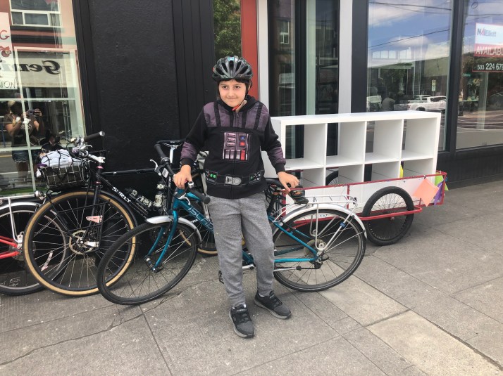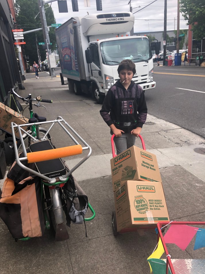 We had a great time on Tuesday helping with the Books with Pictures bike move! Or rather Bike/Walk Move for Books with Pictures, and there was a lot of carrying and hand truck wheeling the three busy blocks between buildings. Going into it I wasn’t sure how long the kids would last, but they made it three hours without complaint! Doughnuts at the outset and a lunch spread in the middle made that possible. I made 11 runs back and forth with one kid coming each time while the other helped with loading and walking loads. Neither were keen to carry things on their own bikes.