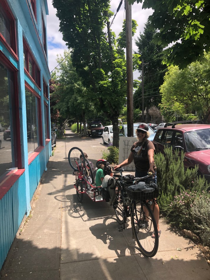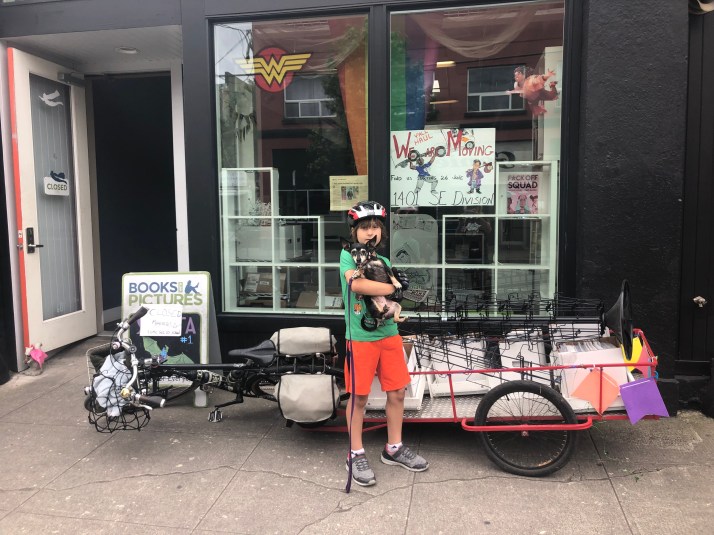 I’ve known of Books with Pictures proprietor Katie Proctor since before I met her thanks to her blog, A Most Civilized Conveyance, on which she recounted biking to the birth center in labor! And showed photos of the amazing baby-seat-carrying boxes on her cargo bike. Katie is one of the two founders of Kidical Mass PDX (I’m currently Co-Director with Sara Davidson) and we’ve held our last two organizers meetings at Books with Pictures.